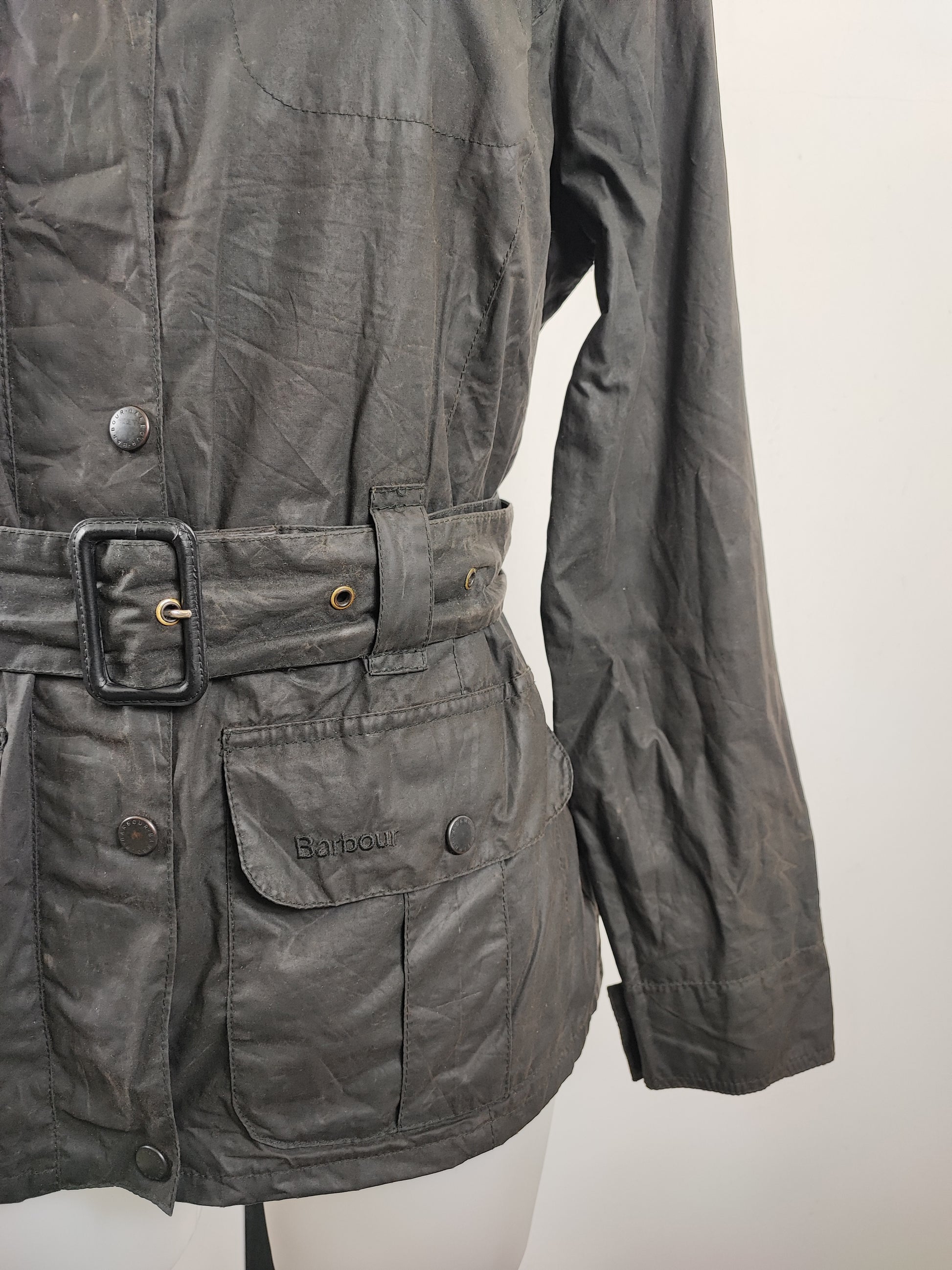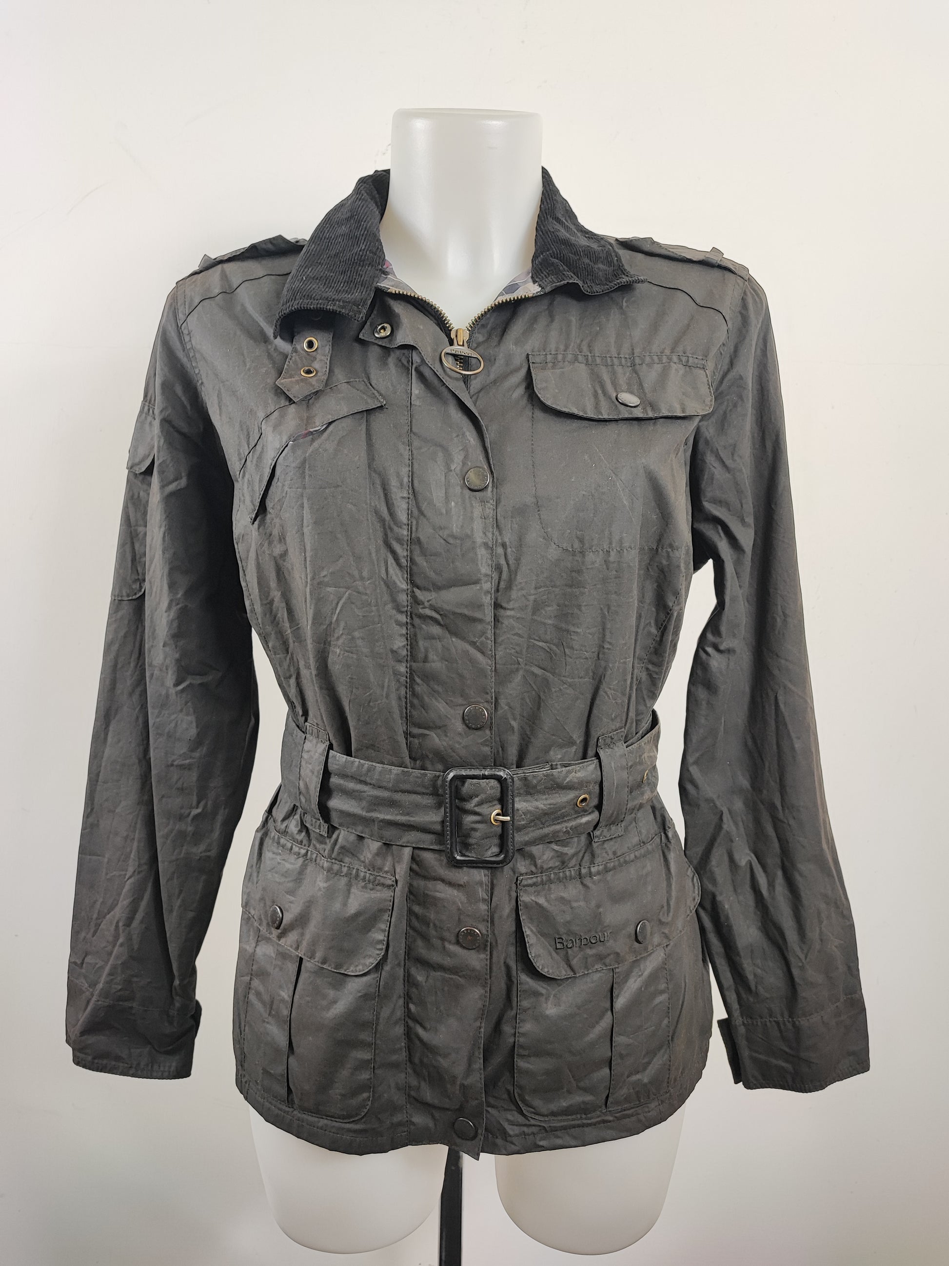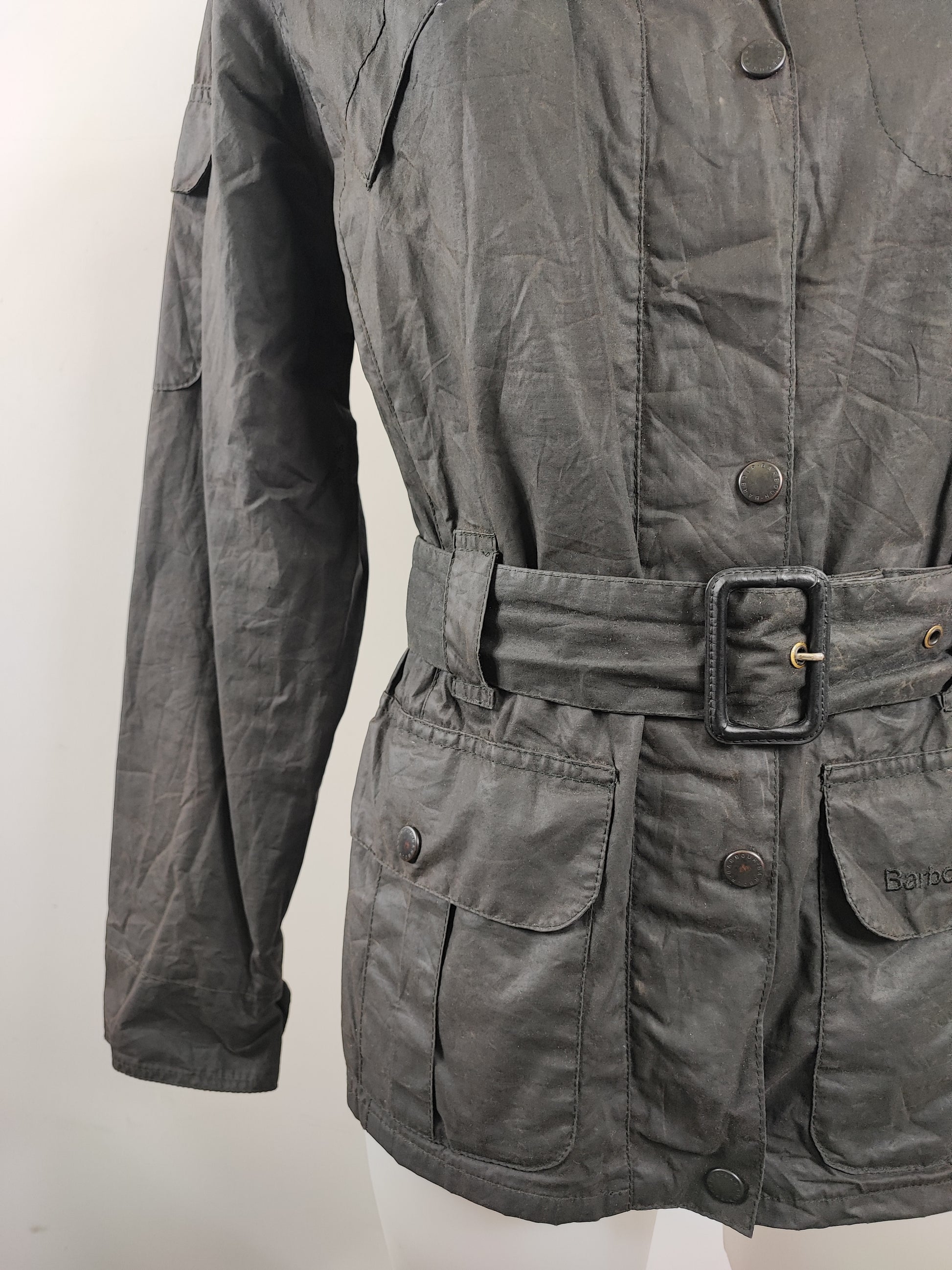 Giacca Barbour di colore nero con quattro tasche frontali in cotone cerato e cintura