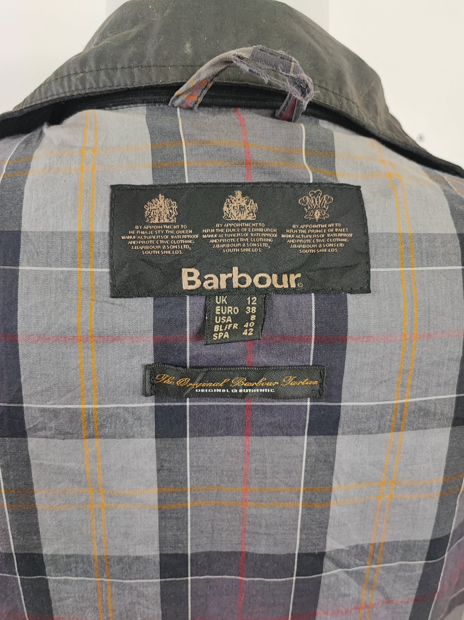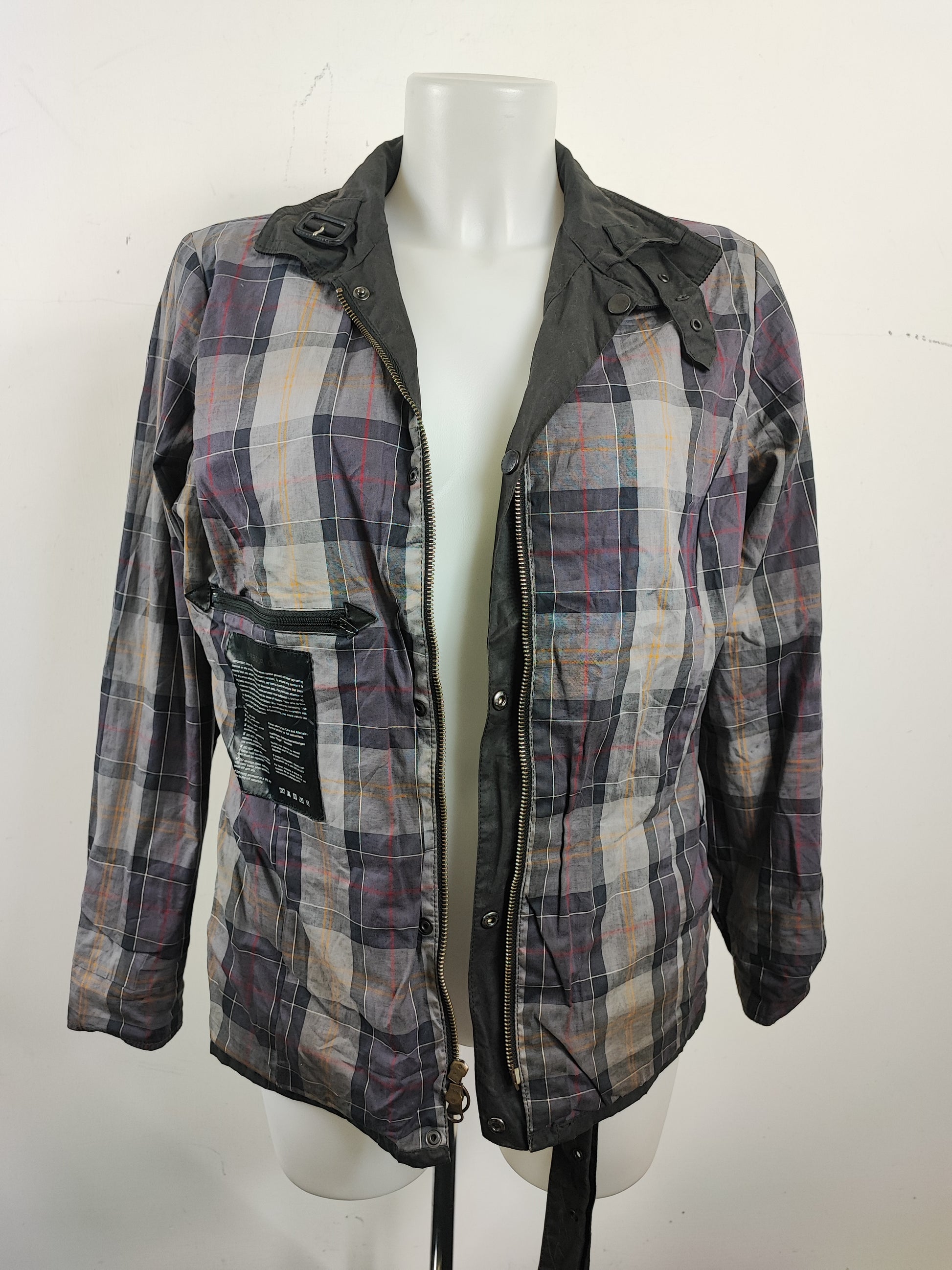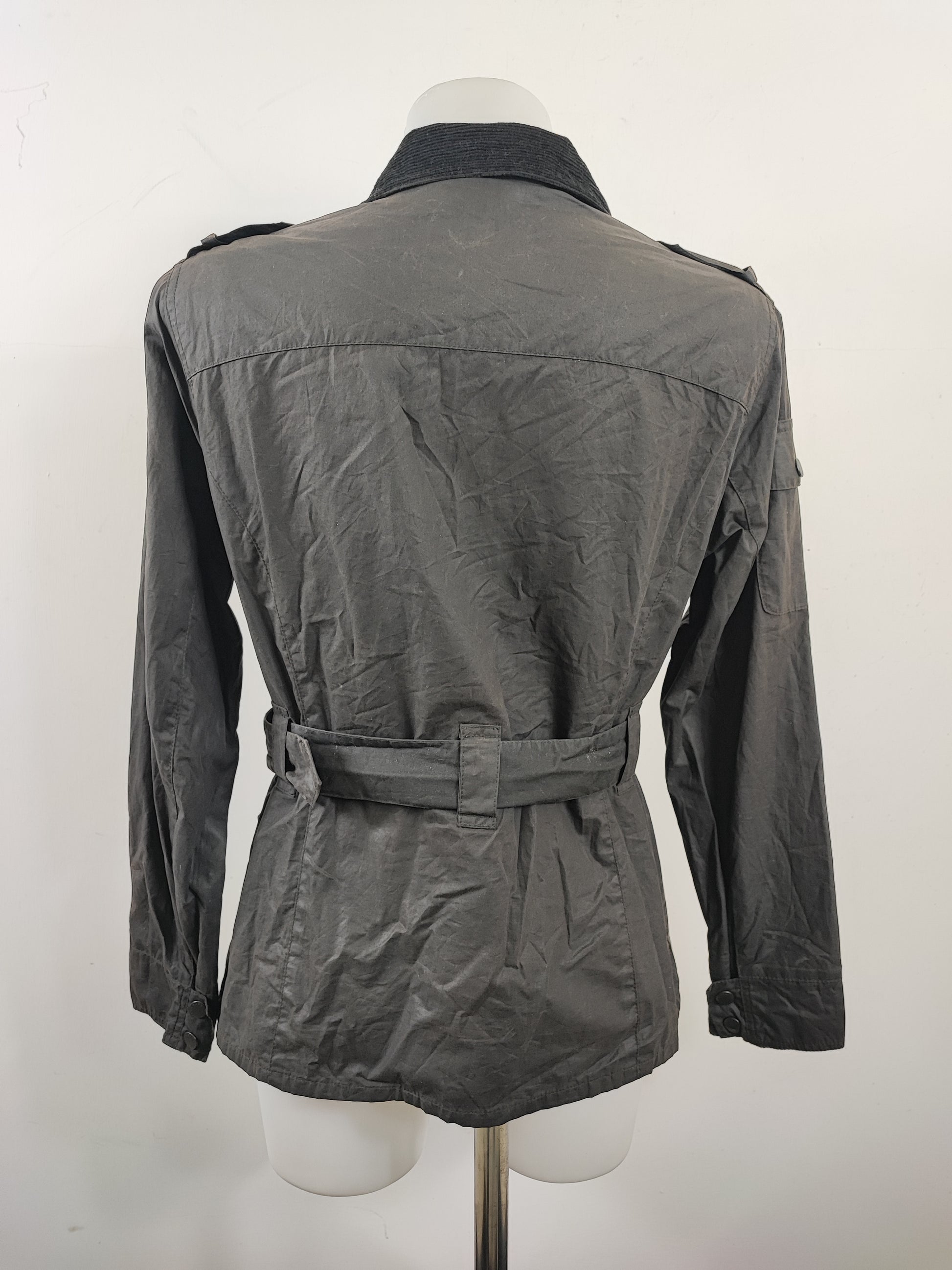 Giacca Barbour di colore nero con quattro tasche frontali in cotone cerato e cintura