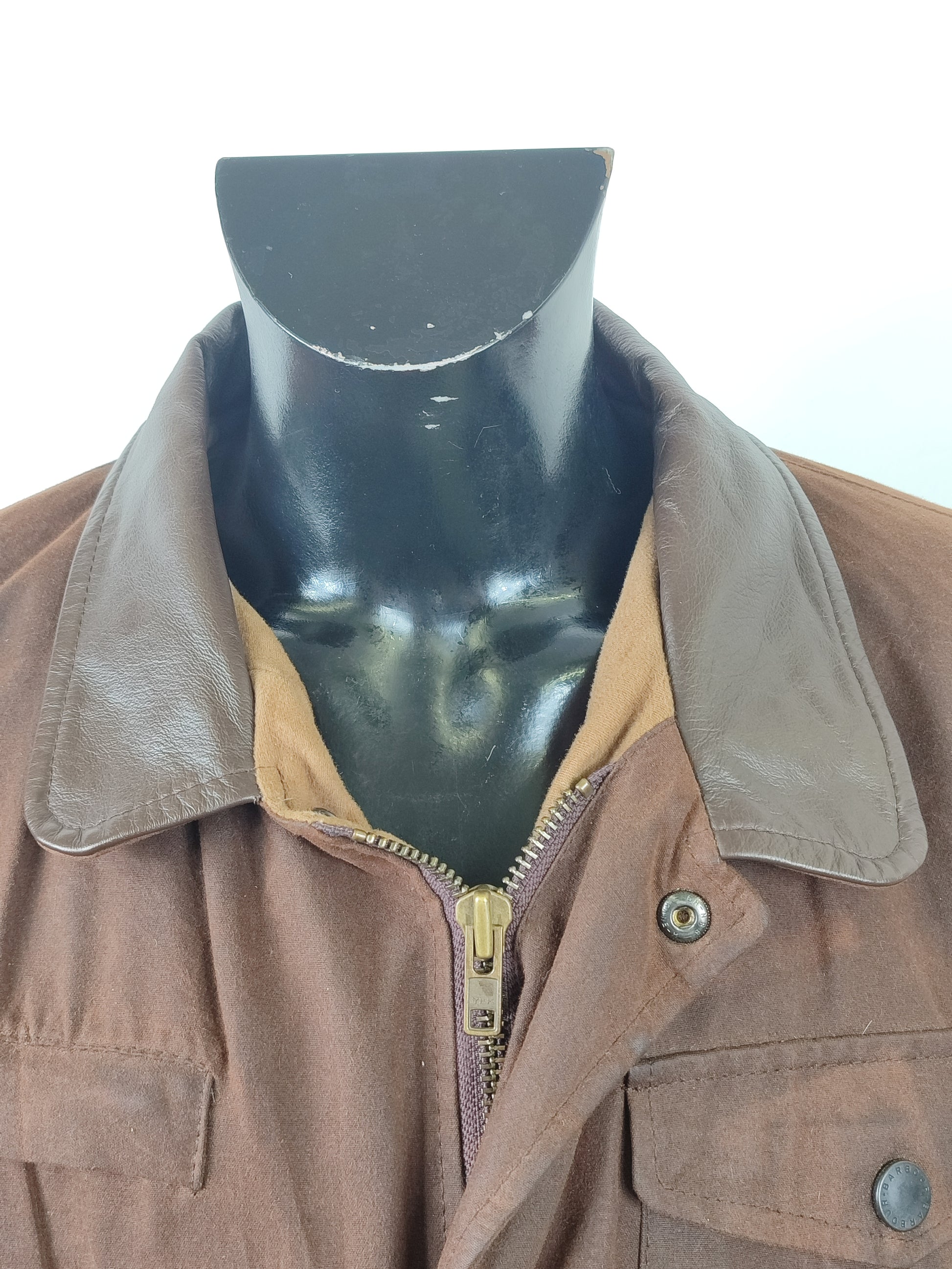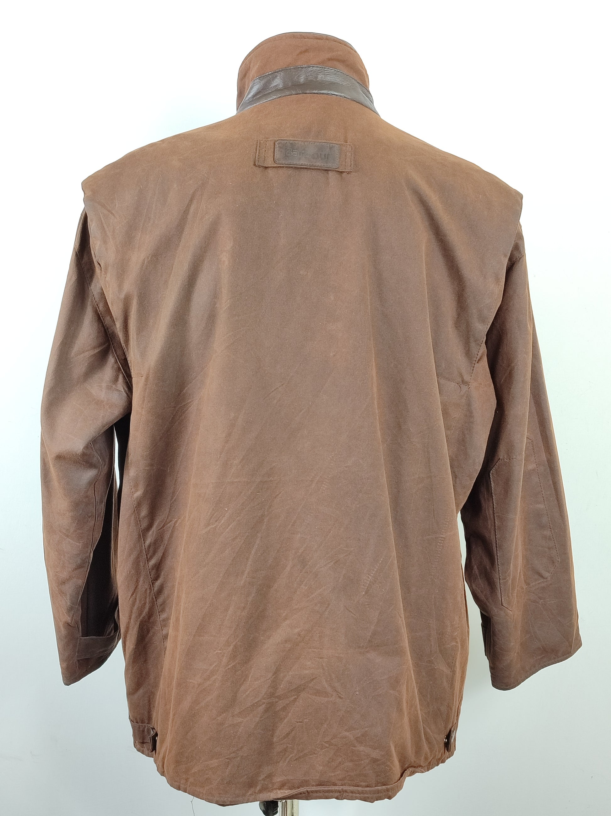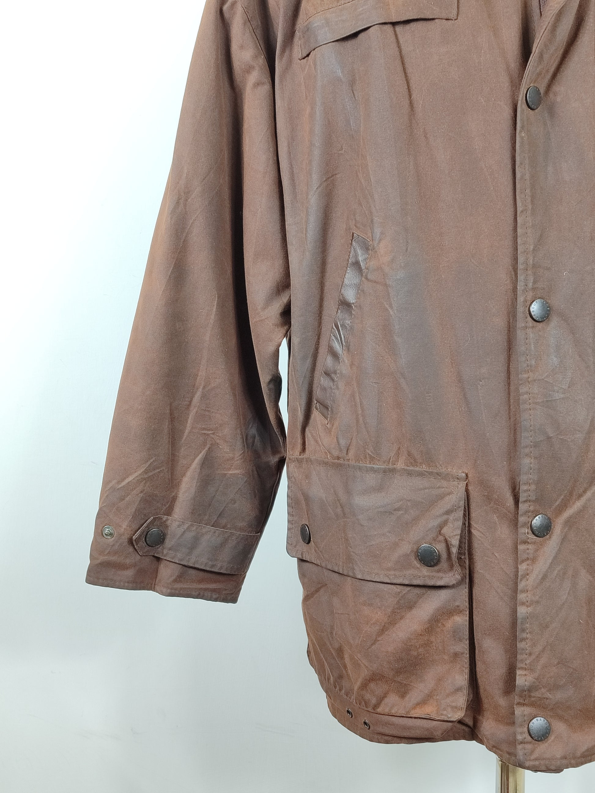 Giacca Barbour Vintage modello Bushman marrone con inserti in pelle sulle tasche e colletto.