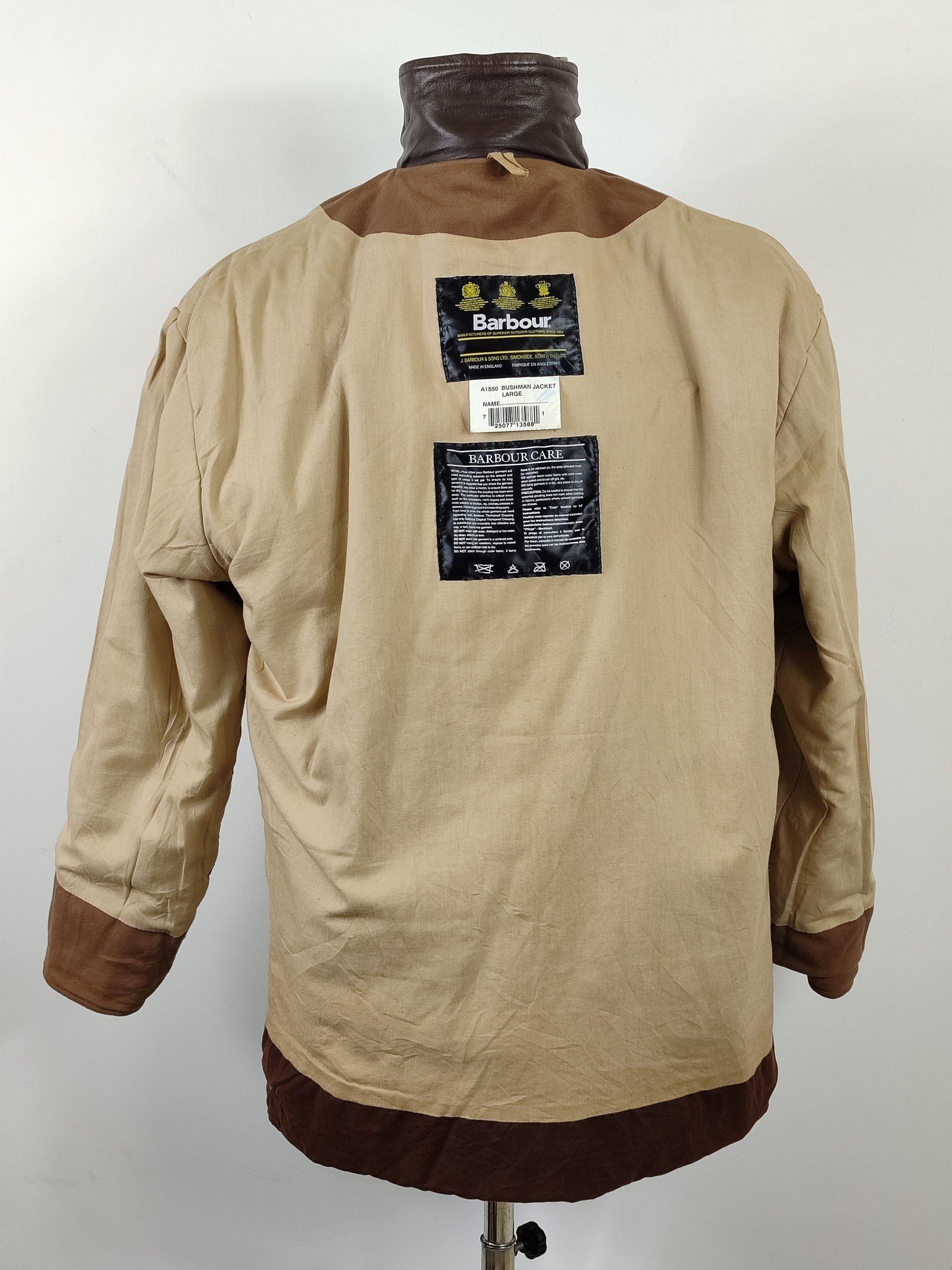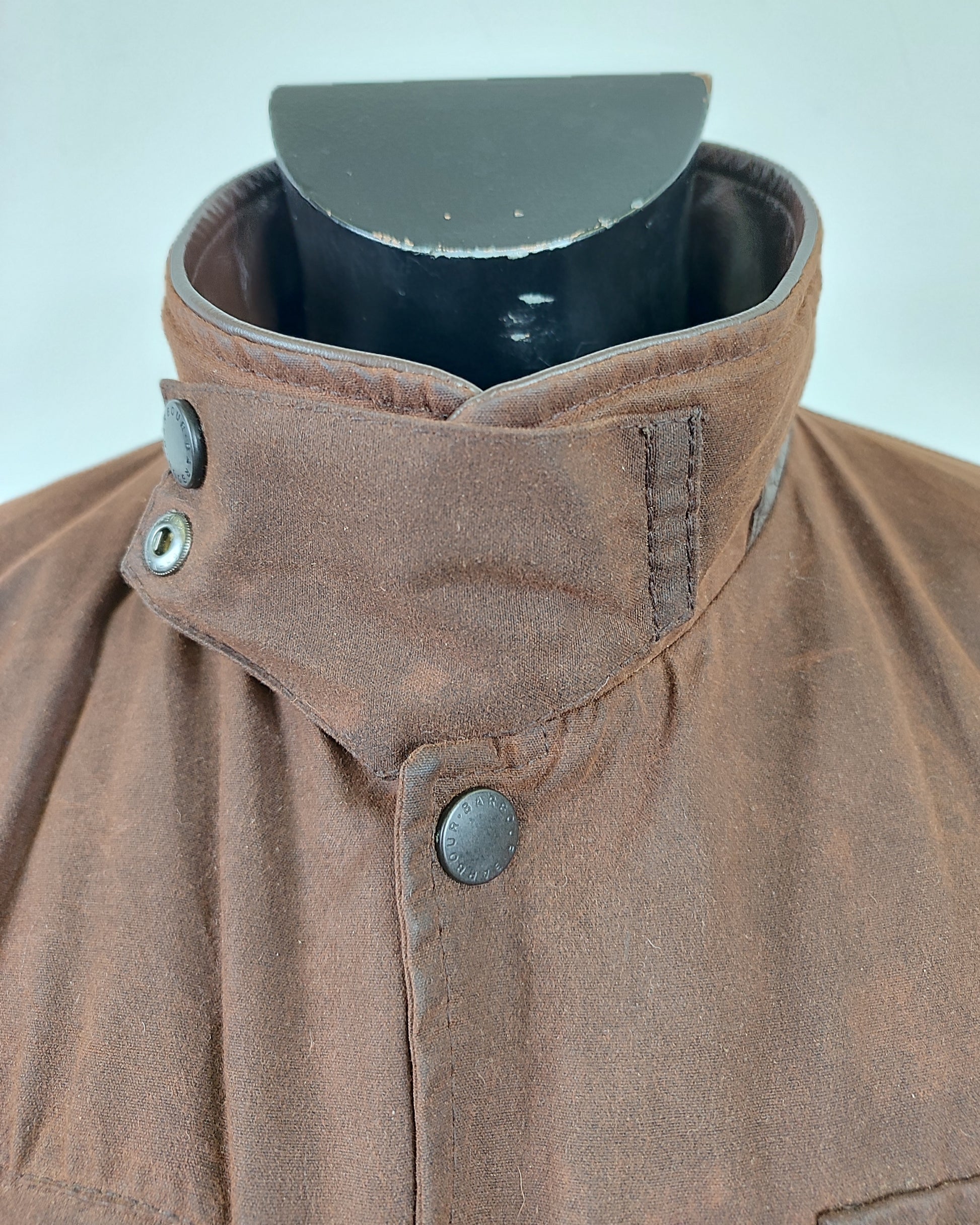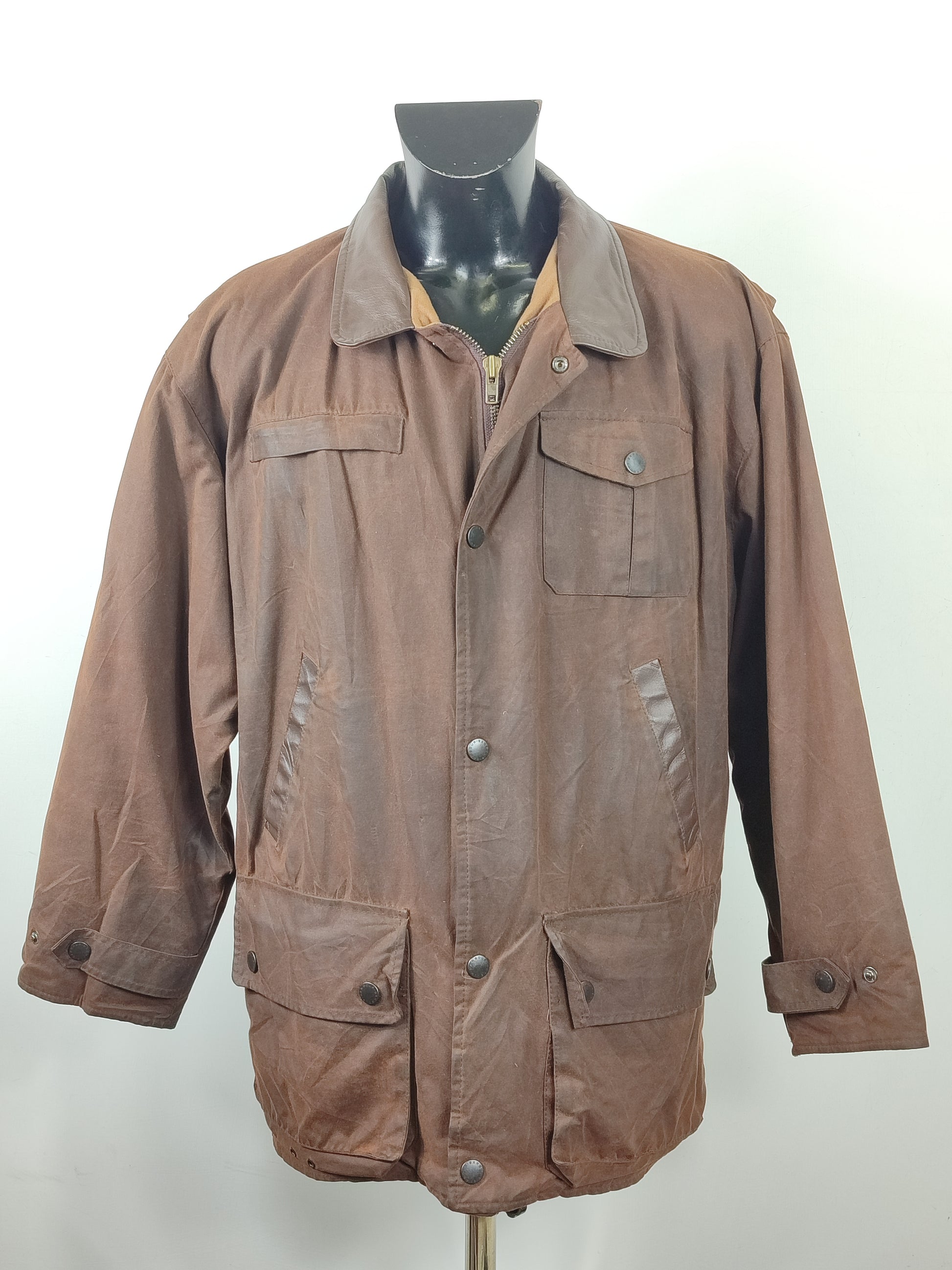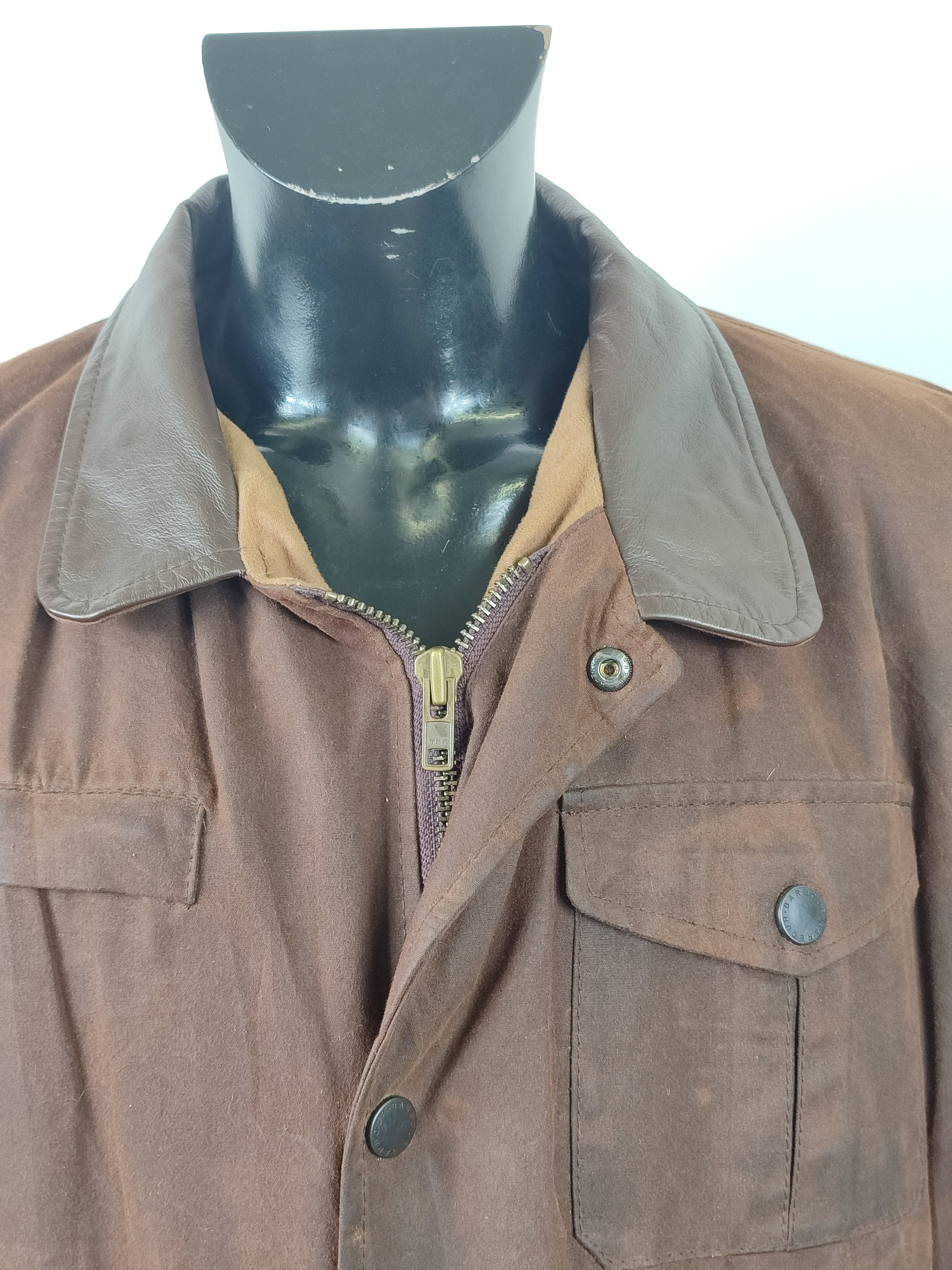 Giacca Barbour Vintage modello Bushman marrone con inserti in pelle sulle tasche e colletto.