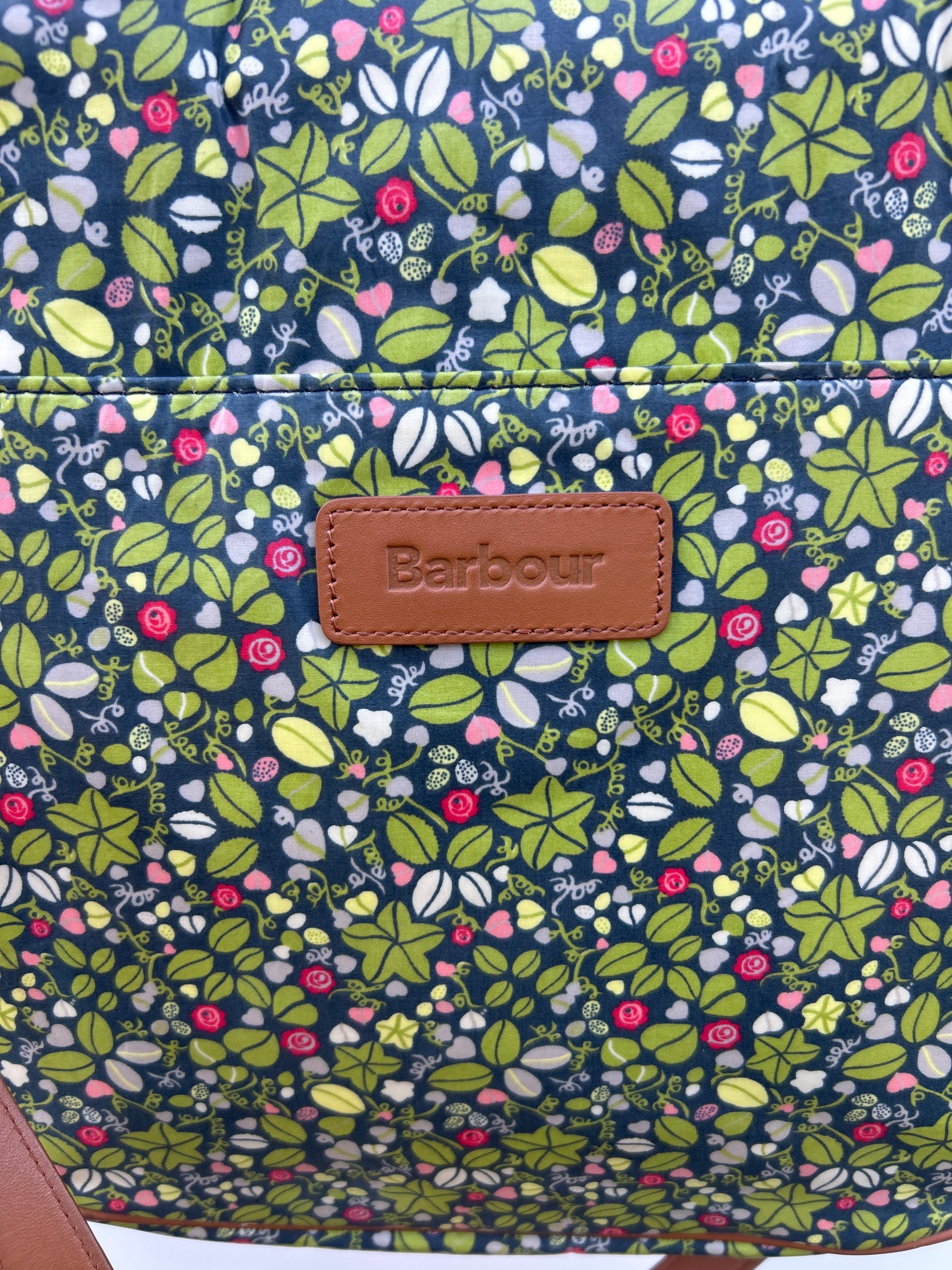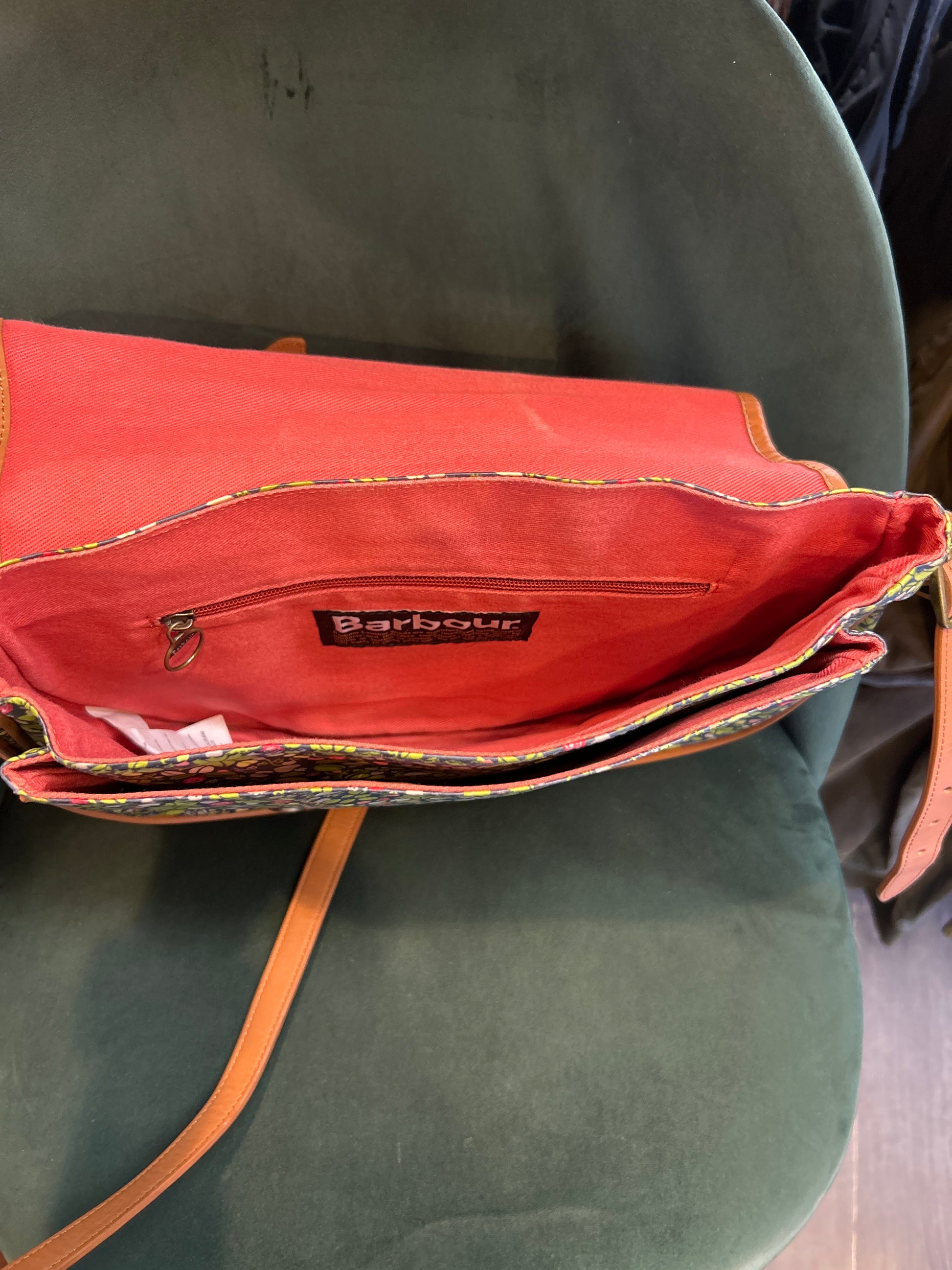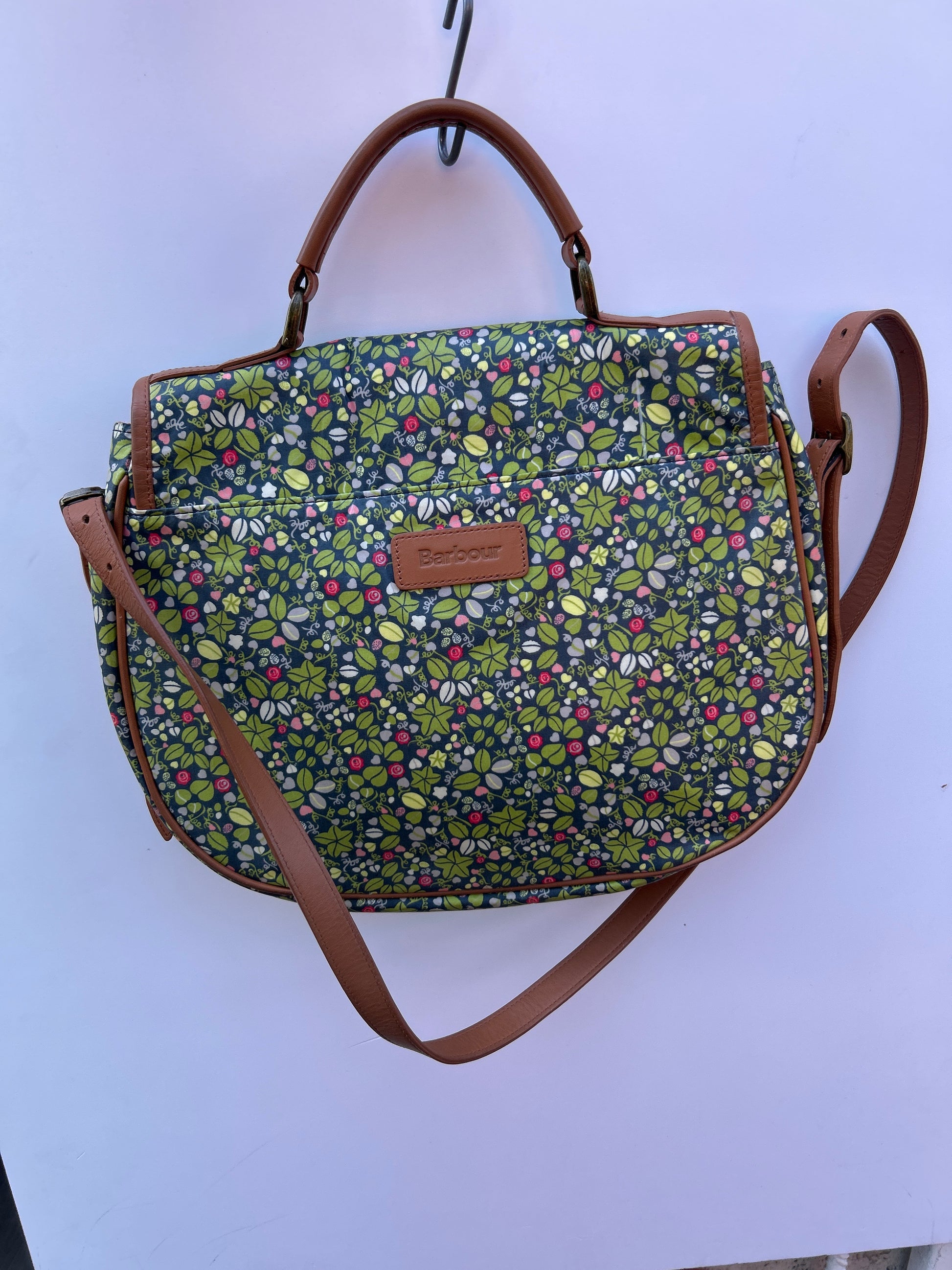 Borsa Barbour verde a tracolla con fantasia stampata sulla parte esterna e inserti in pelle marrone chiaro .
