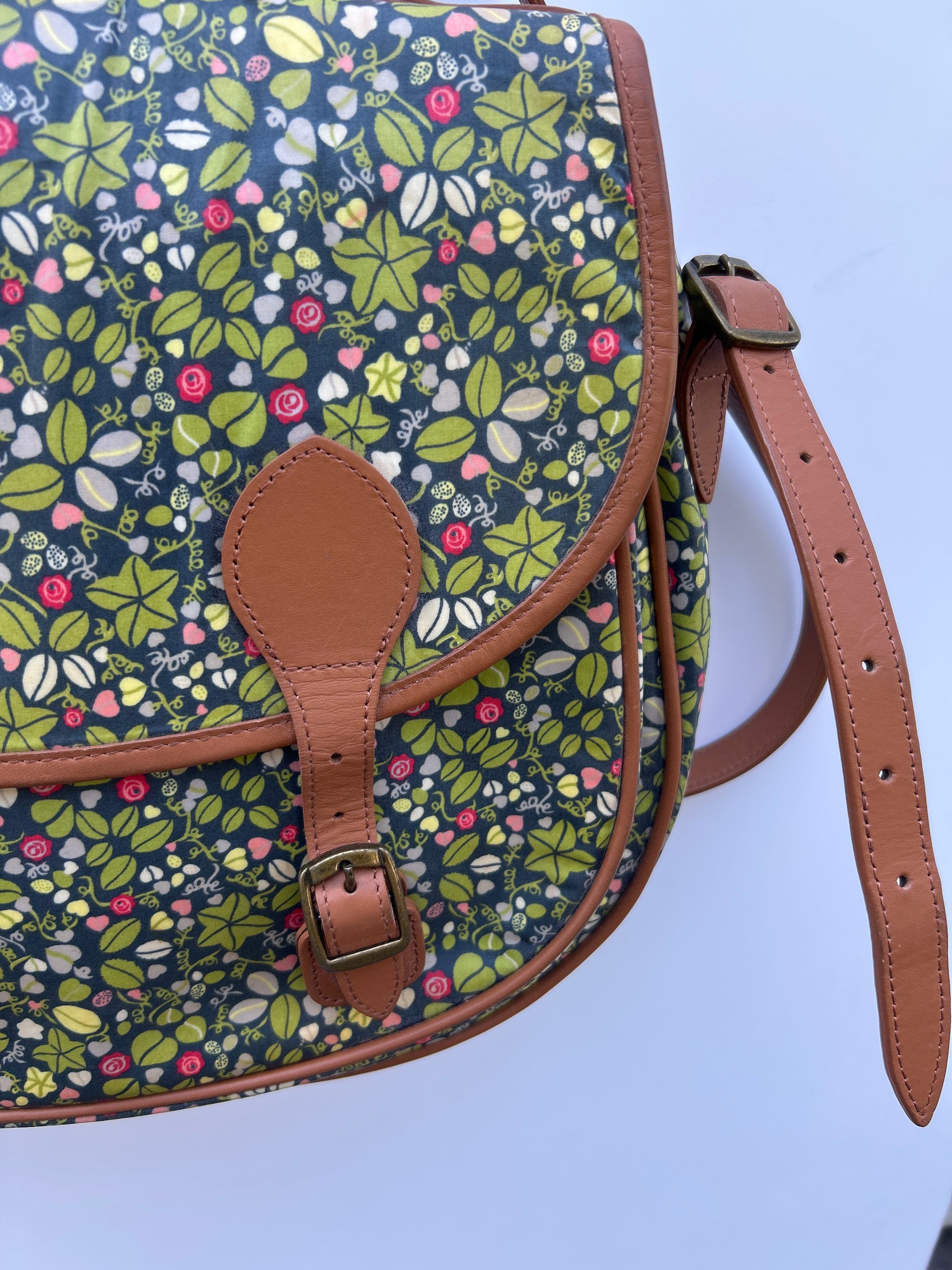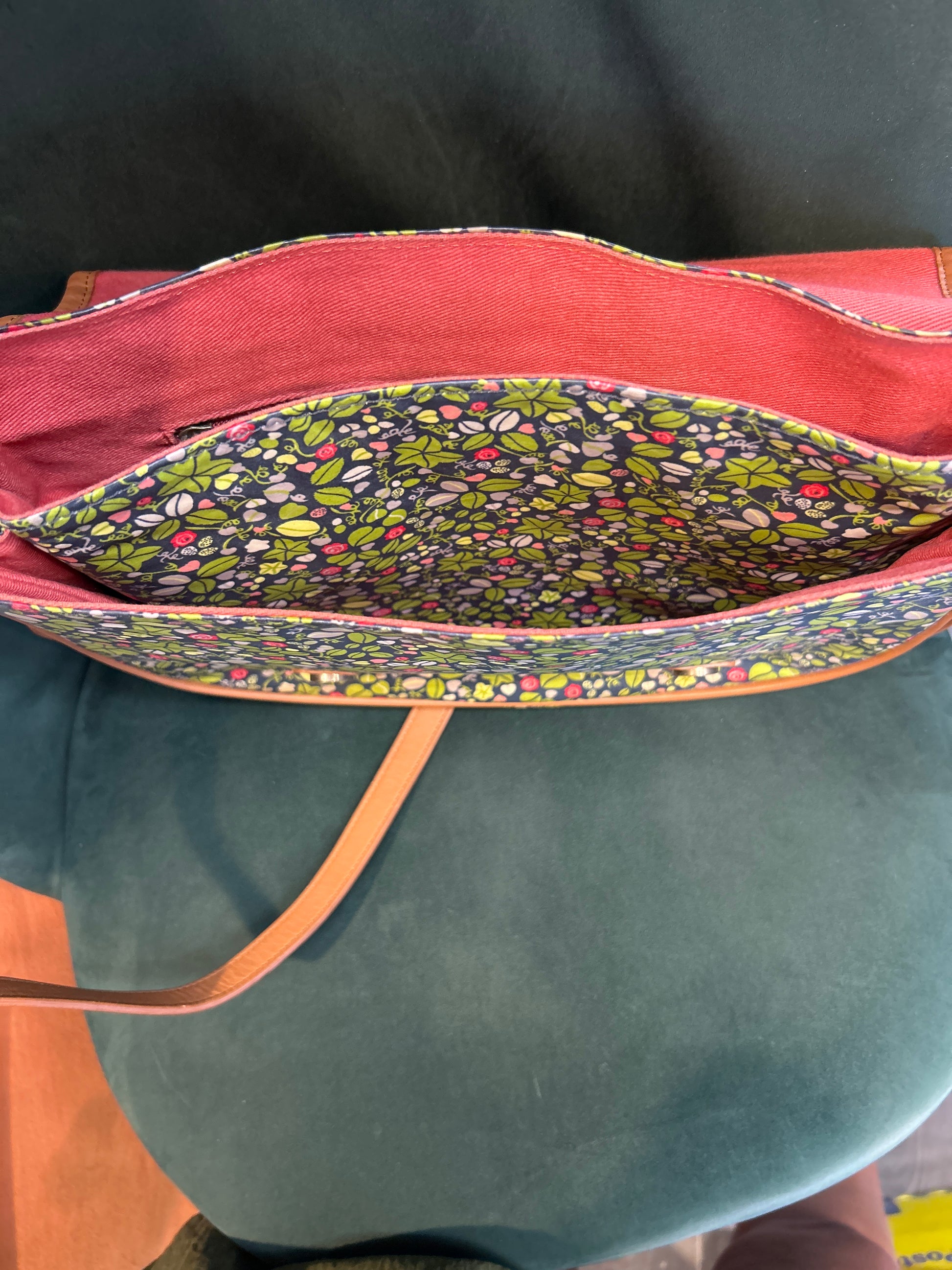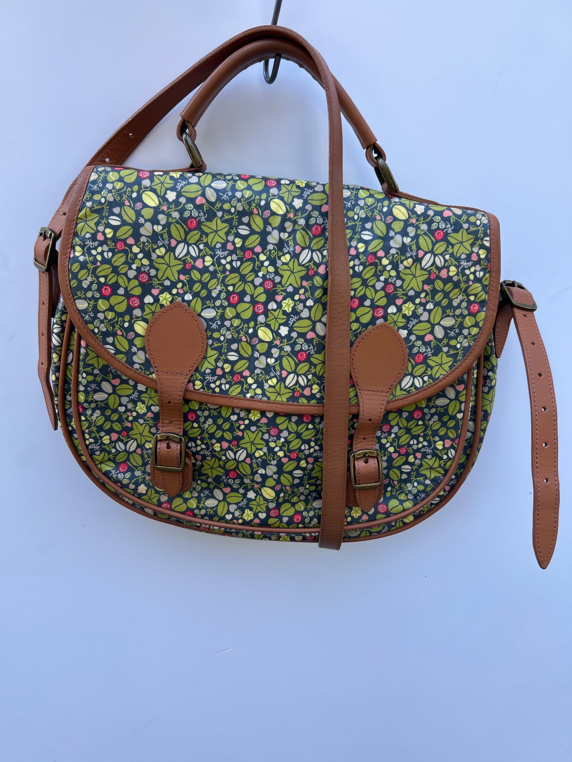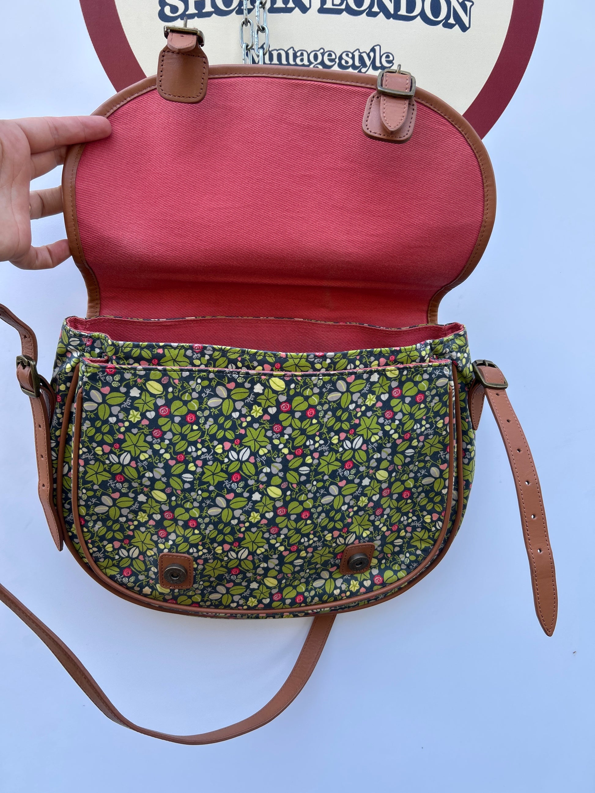 Borsa Barbour verde a tracolla con fantasia stampata sulla parte esterna e inserti in pelle marrone chiaro .