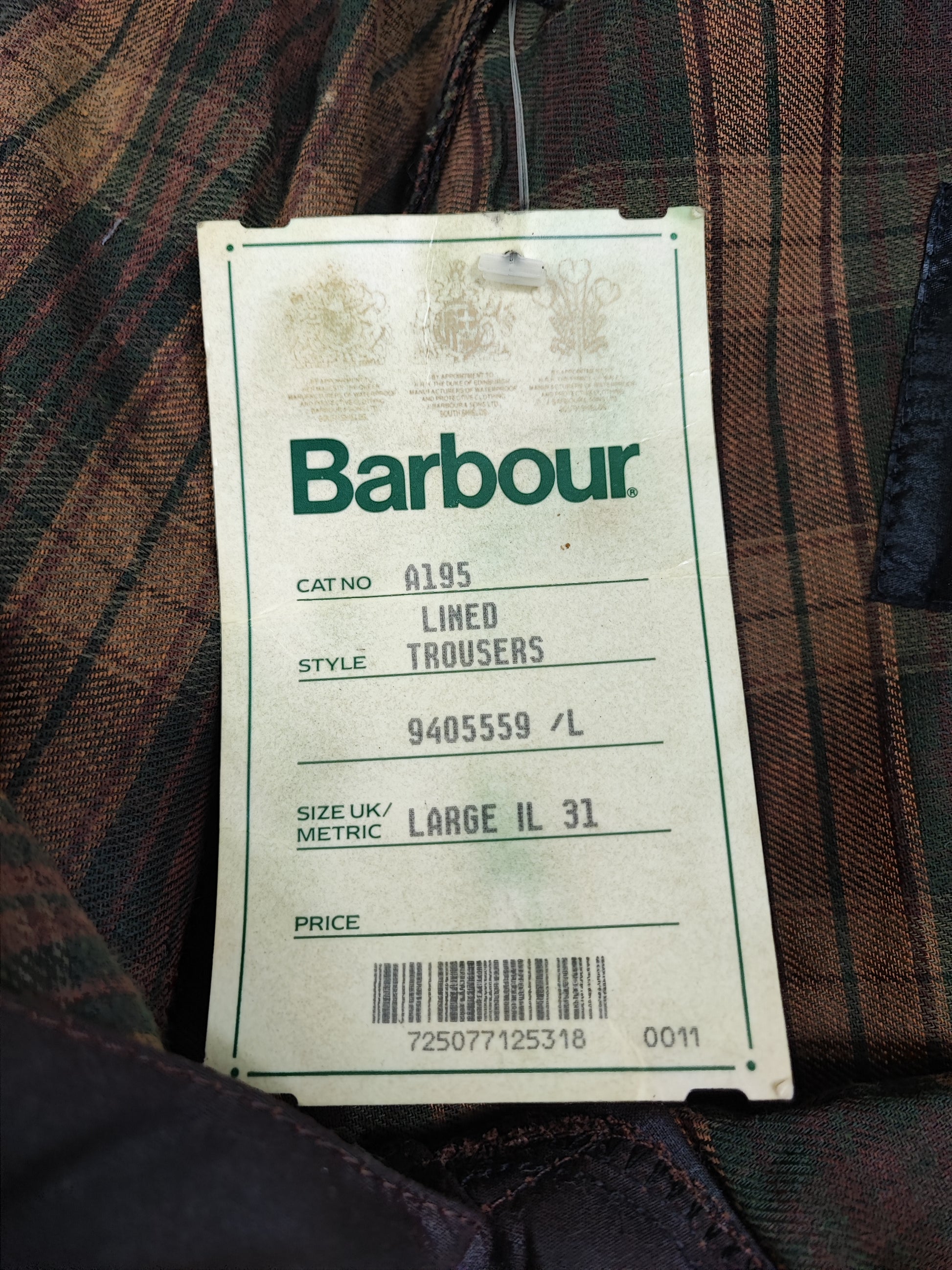 Cosciali vintage Barbour cerati marroni LARGE - Wax Man Brown A195 Lined trousers Size Large
