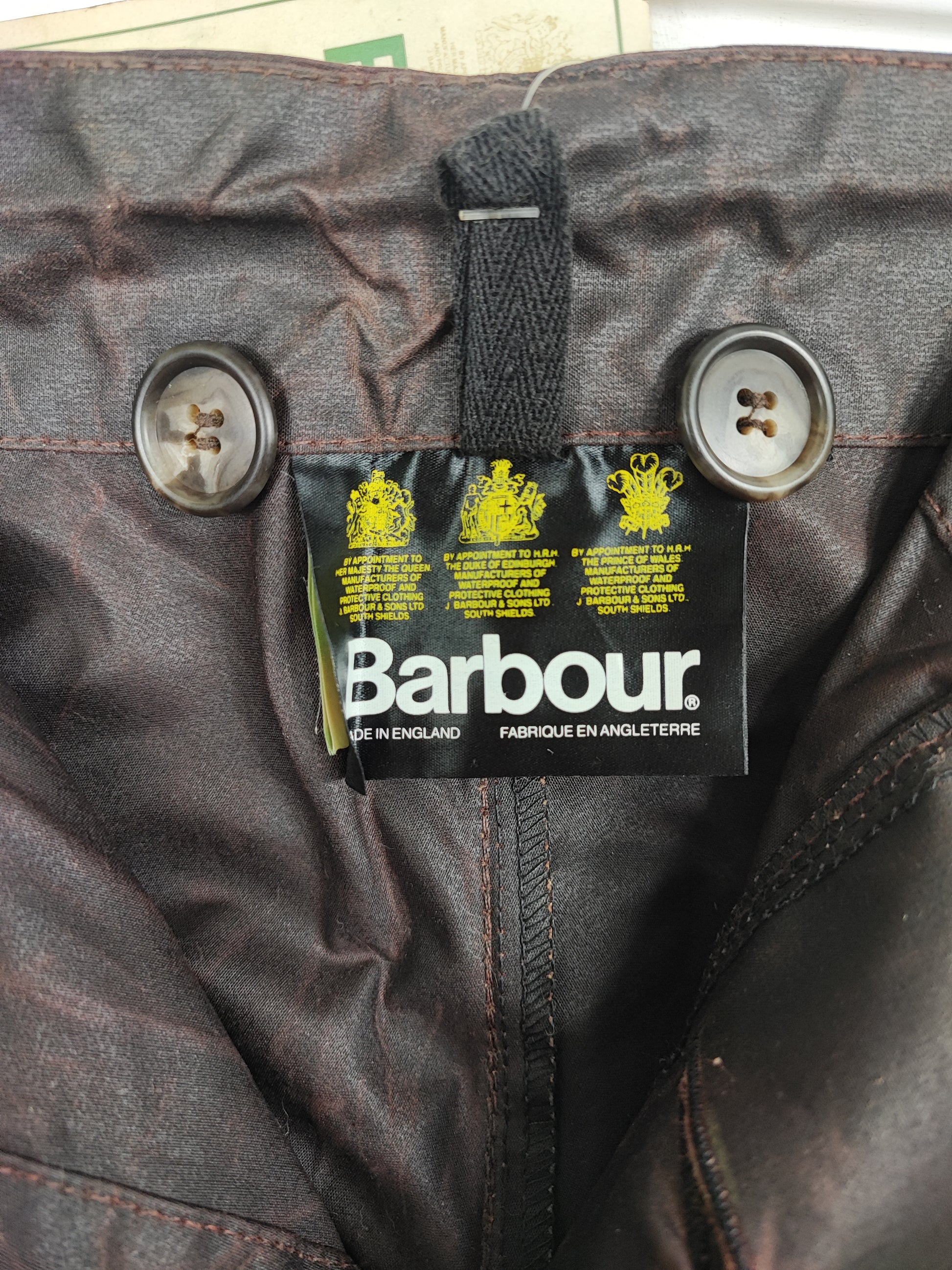 Rari cosciali cerati vintage della Barbour MAI UTILIZZATI in cotone cerato di colore marrone