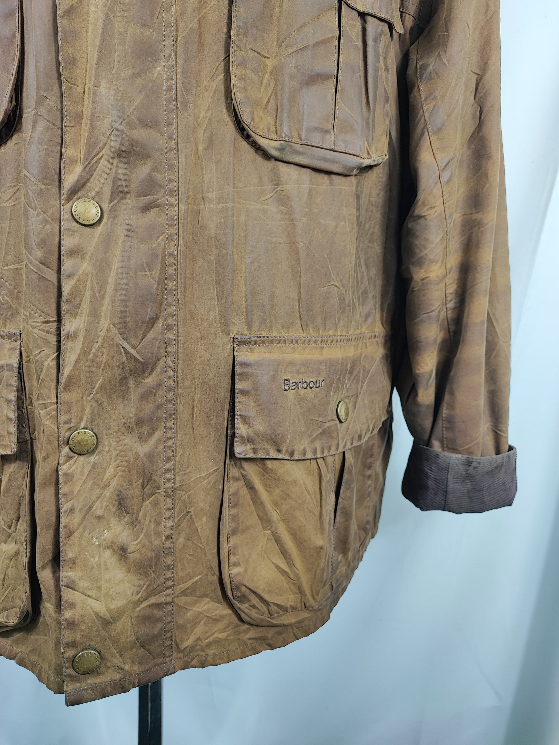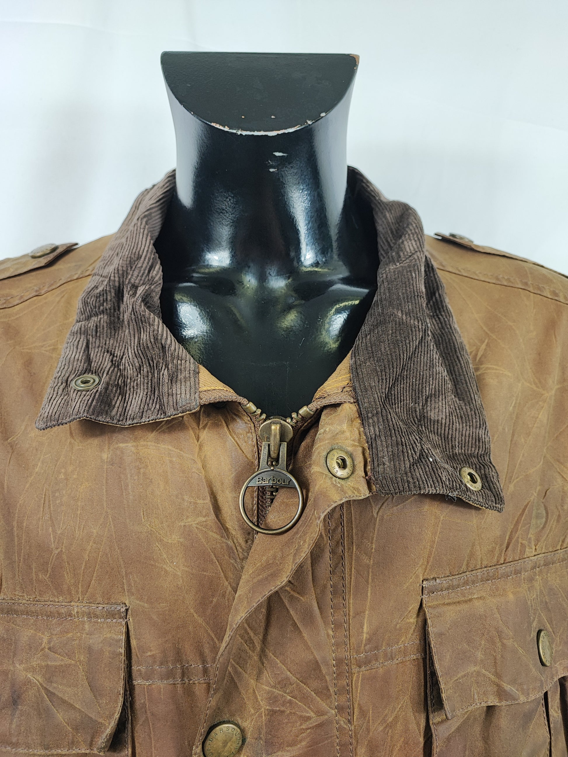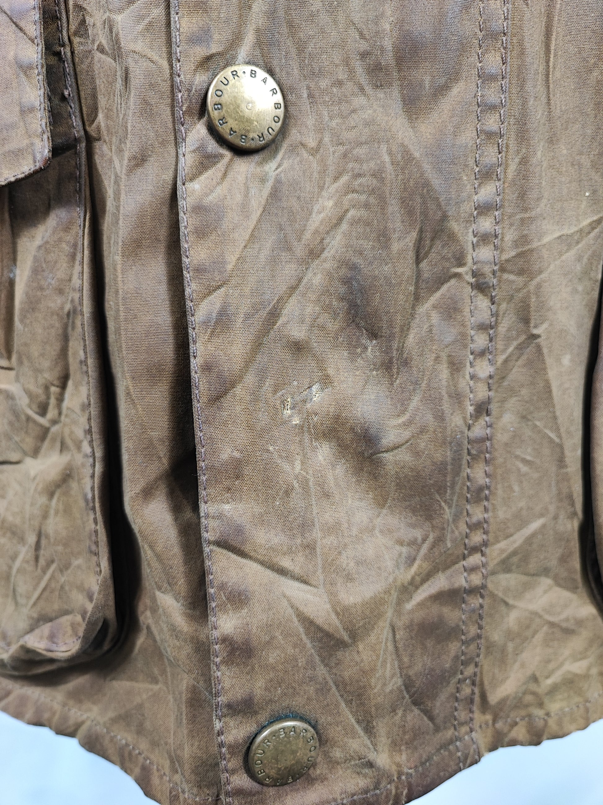 Buone condizioni. Leggera usura sulla parte frontale e logo Barbour della cerniera leggermente storto ma la cerniera è funzionante. IL capo è di SECONDA MANO.