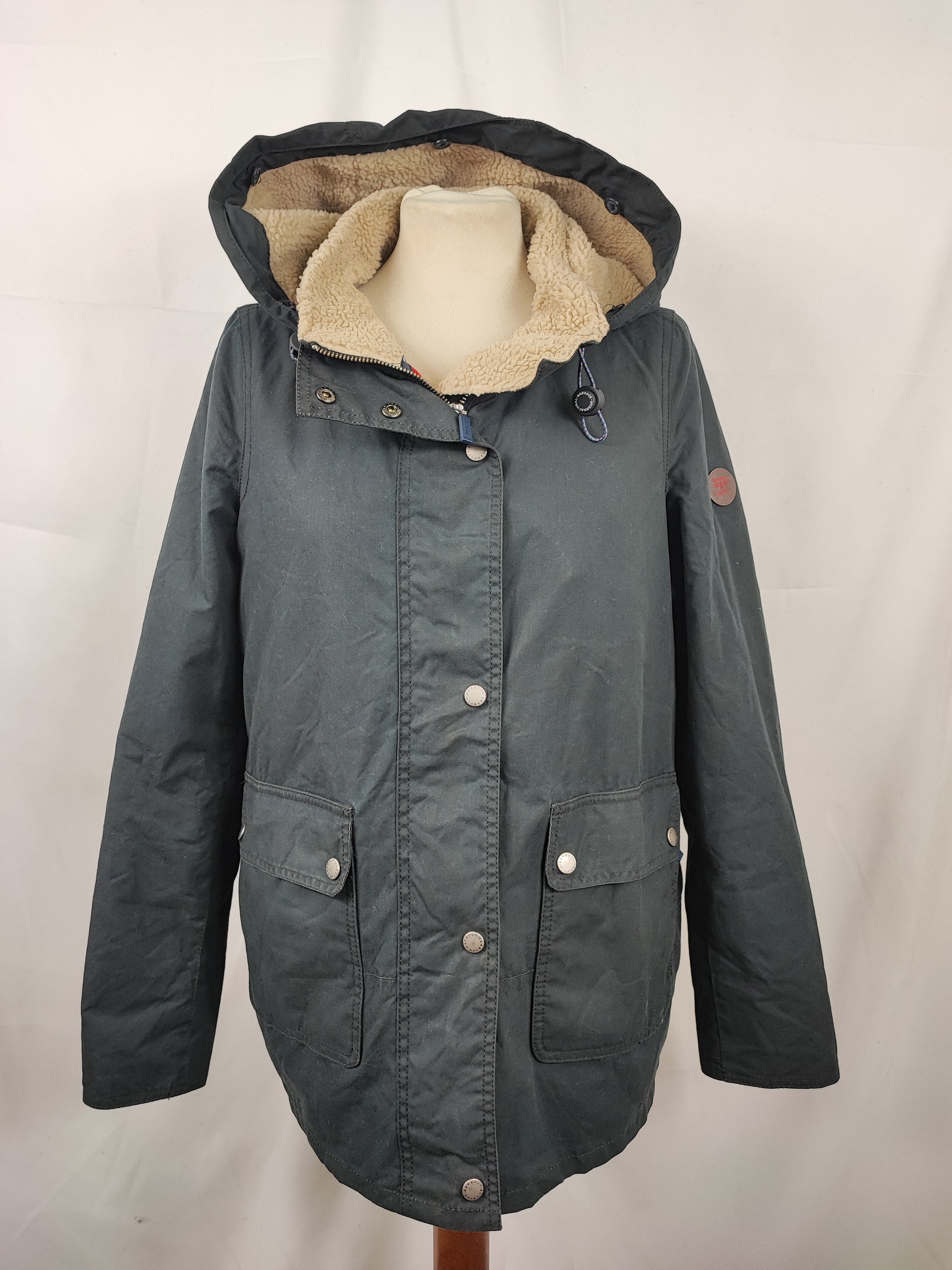 Giacca da donna di colore blu Barbour modello Crevasse con cappuccio e pelo rimovibile taglia UK 14 corrisponde ad una 44 italiana o Medium ( LEGGERE MISURE QUI SOTTO)