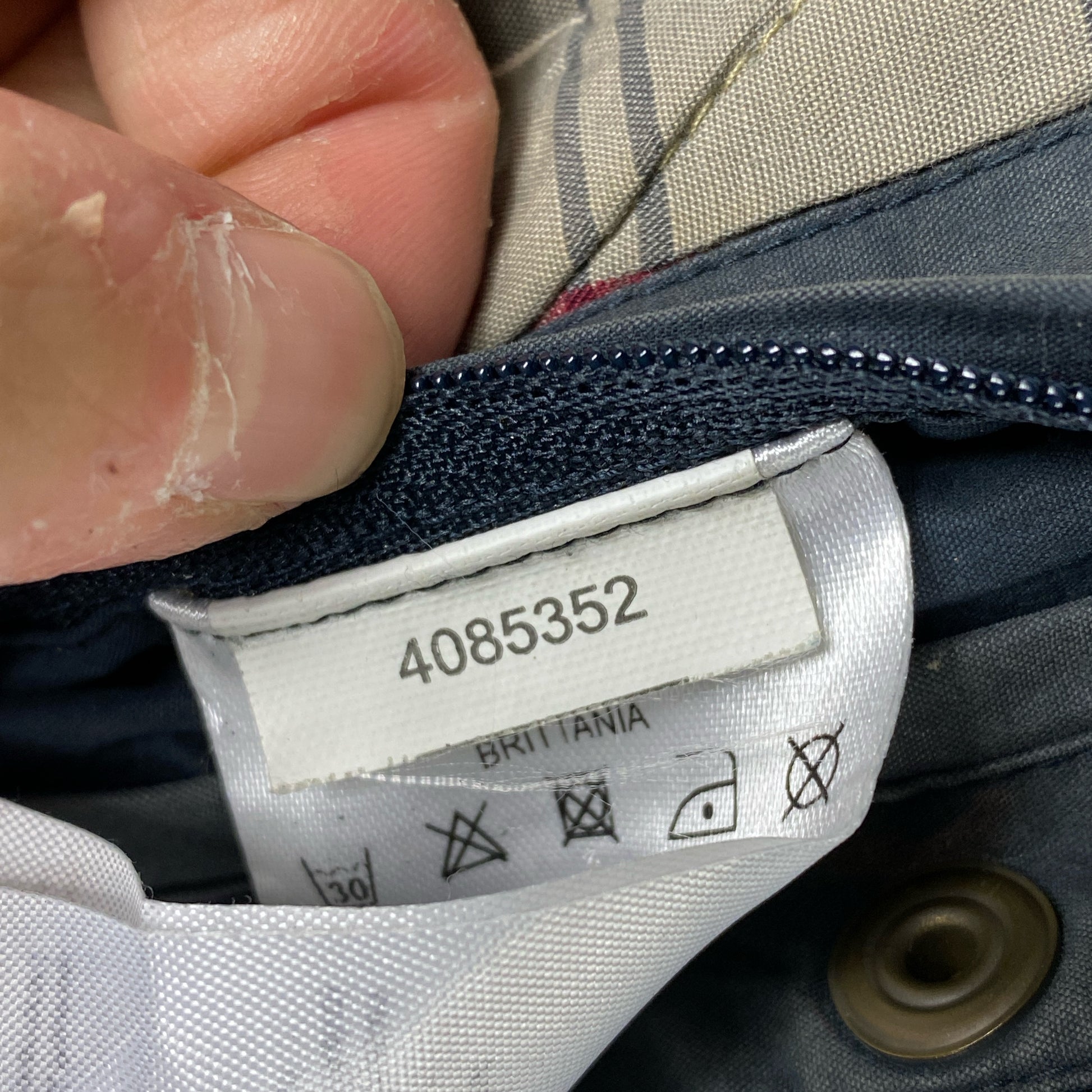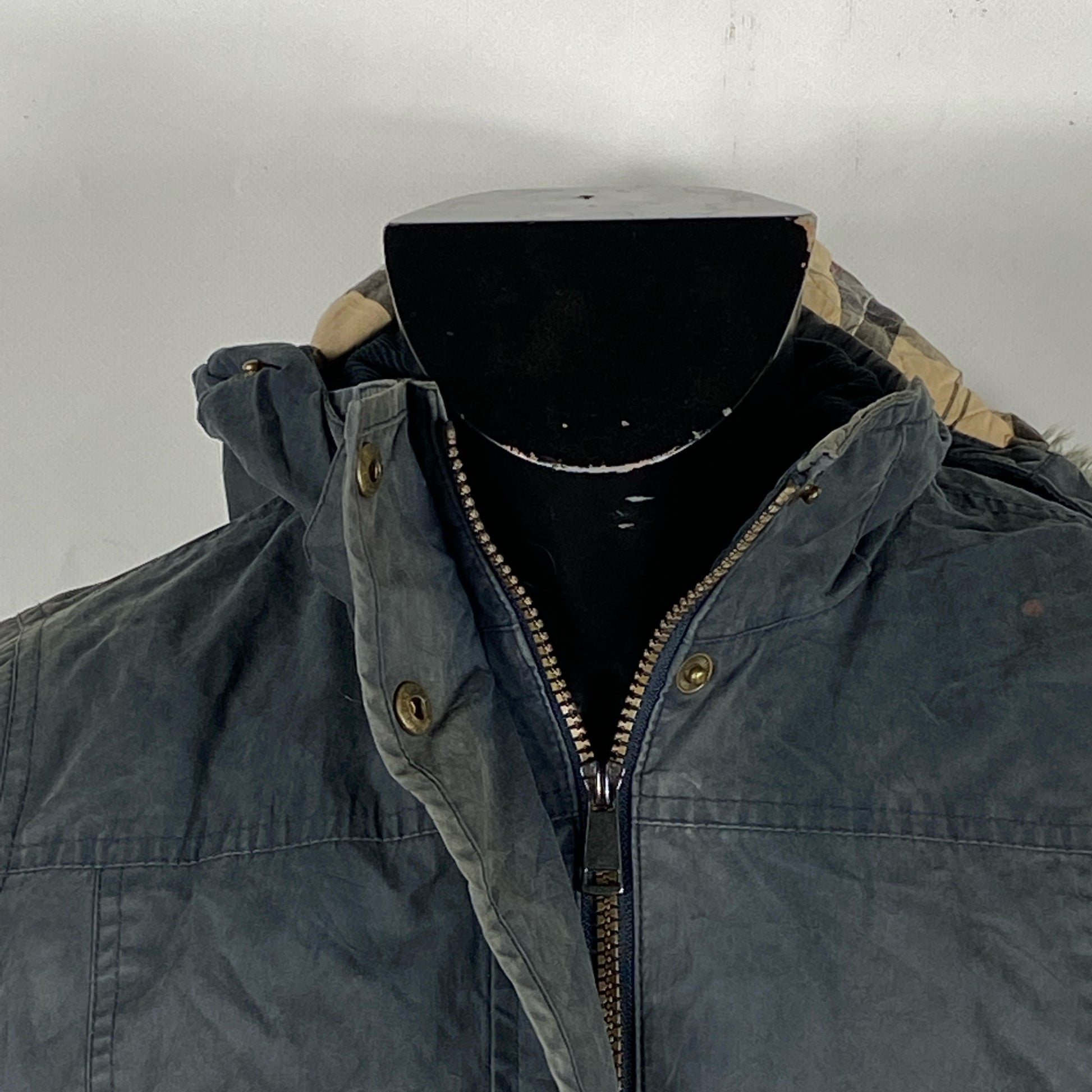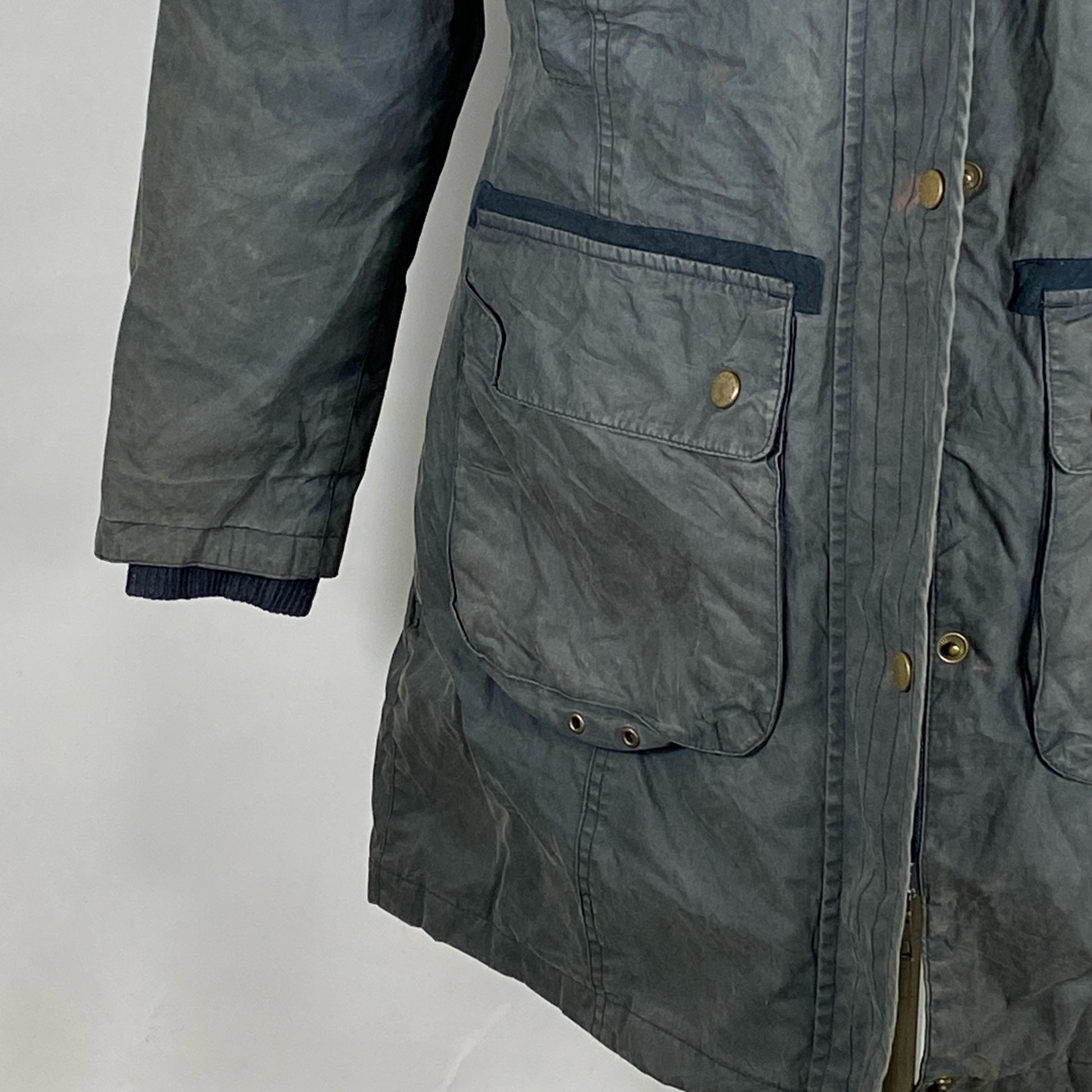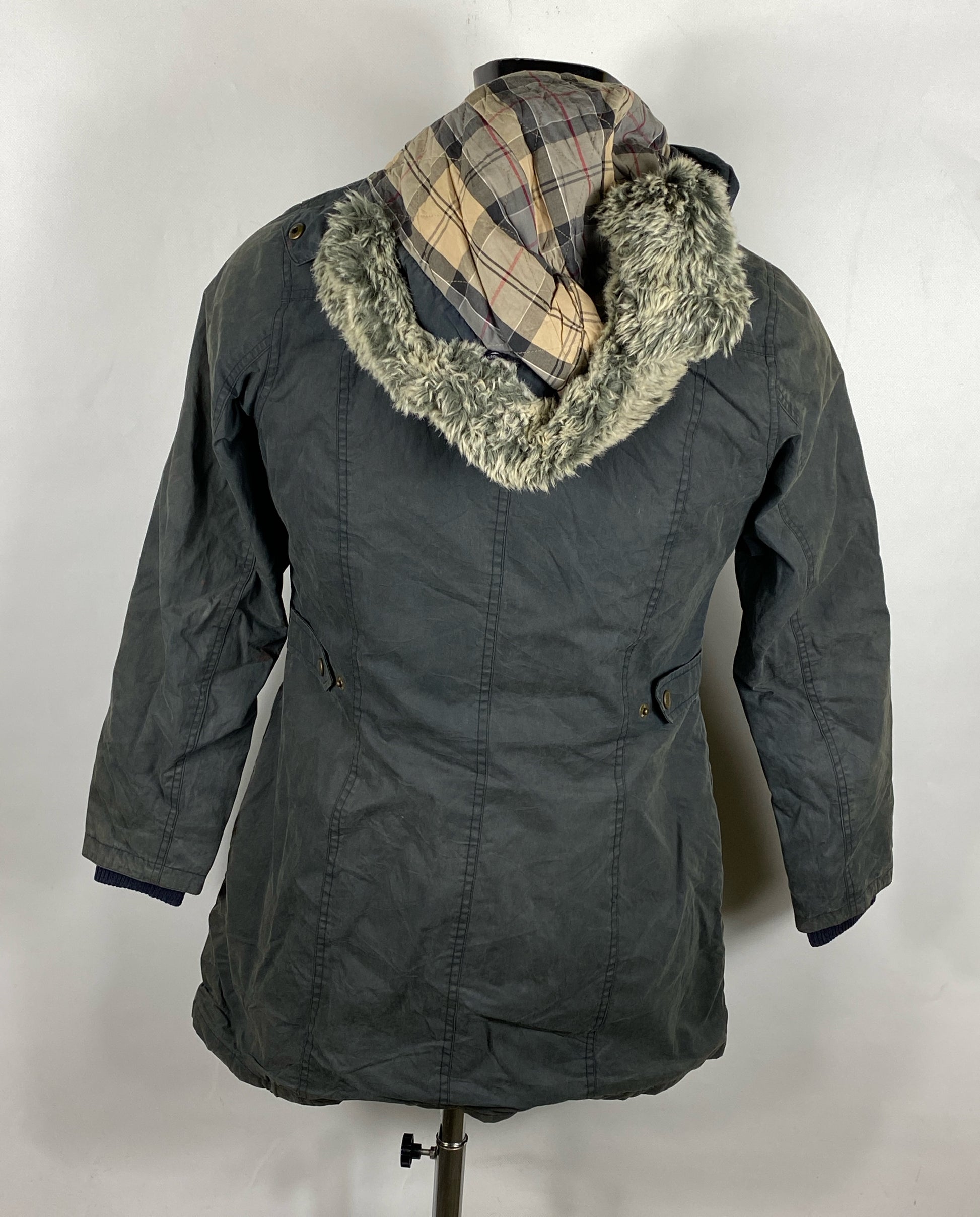 Giacca con cappuccio Impermeabile in cotone NON CERATO di colore blu taglia uk12 modello Brittania . Pelo del cappuccio amovibile, polsini antivento.