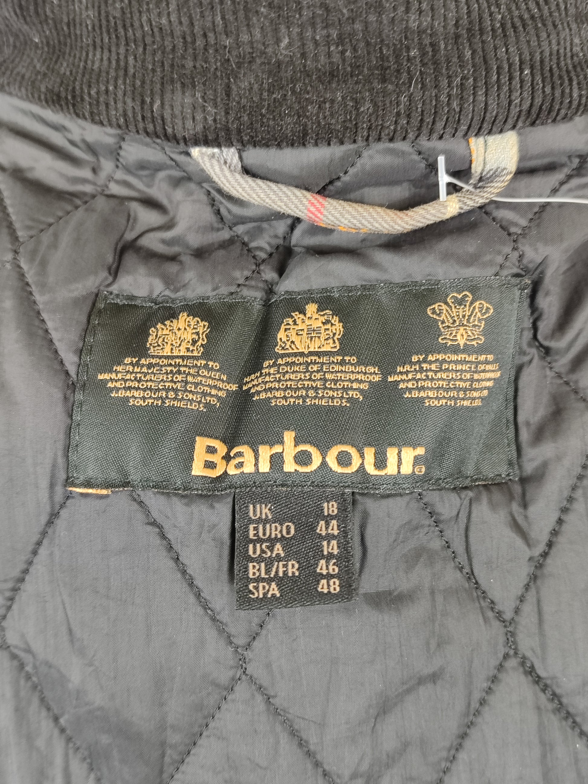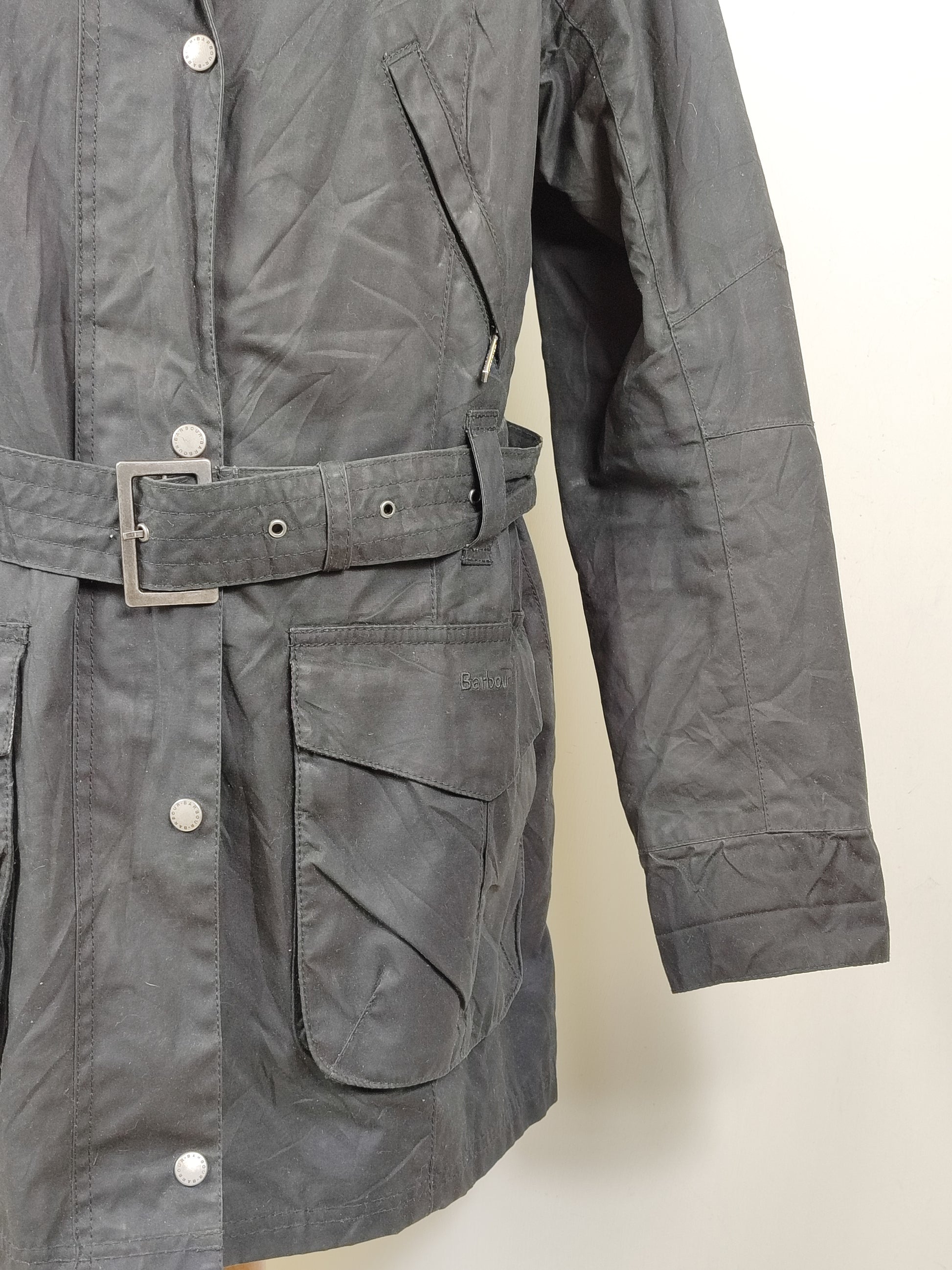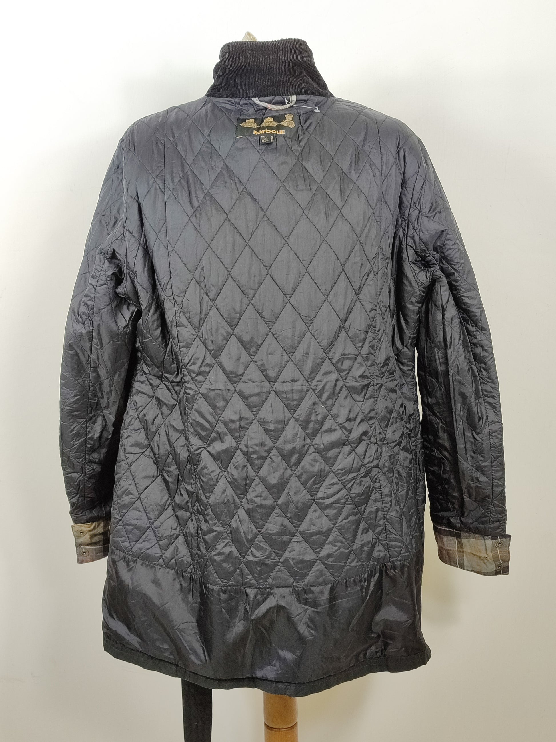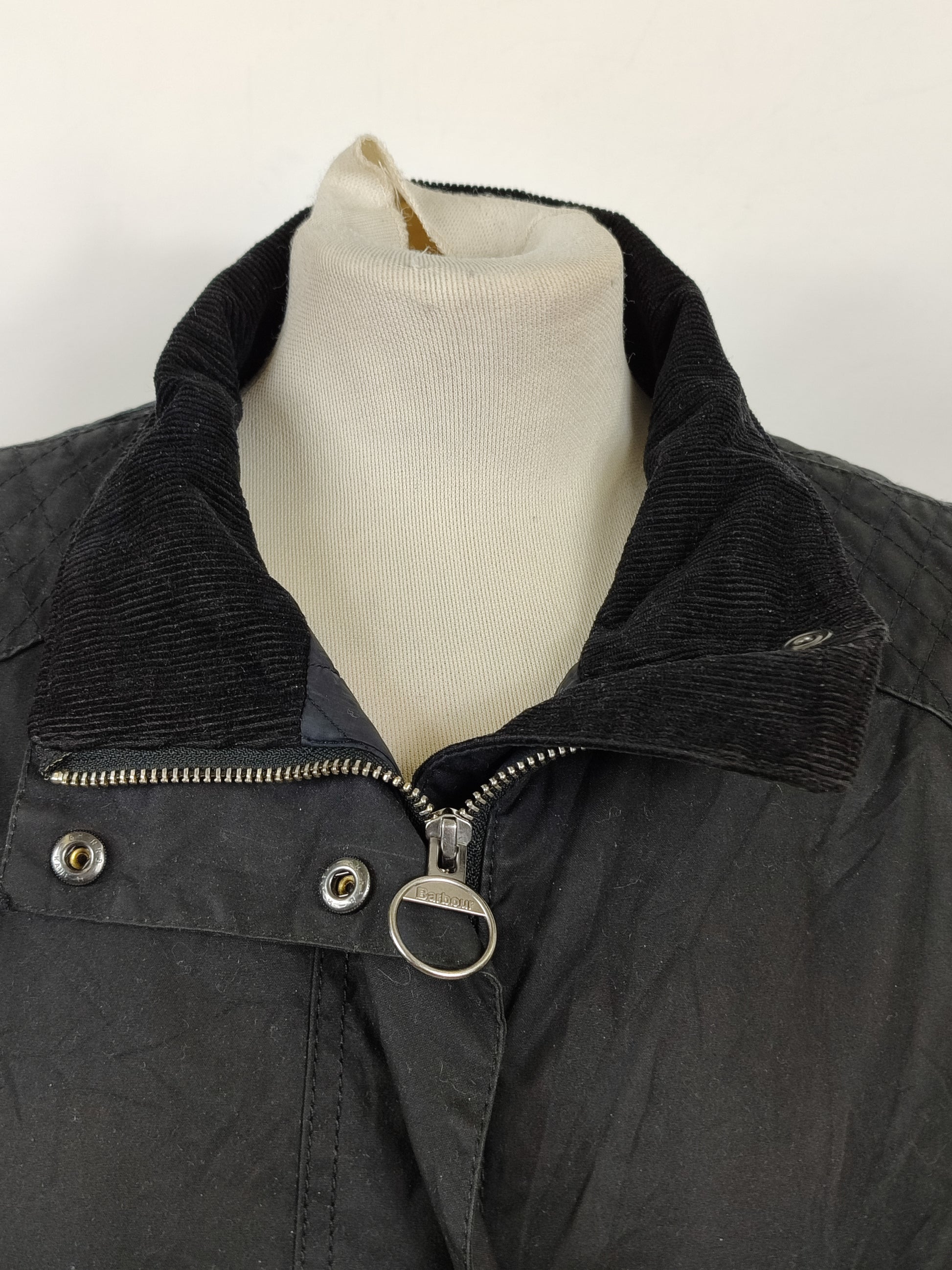 Giacca Barbour in cotone cerato di colore nero, trapuntata internamente come da foto. Completa di cintura