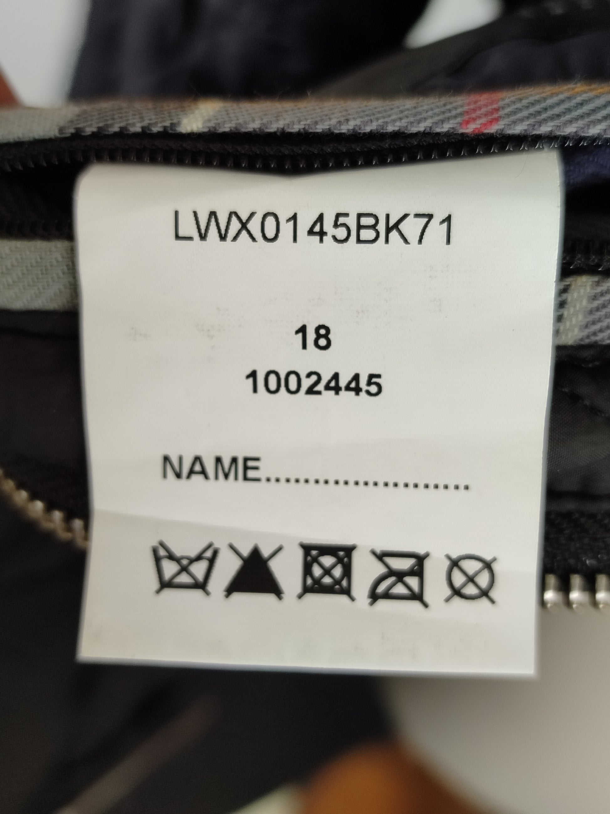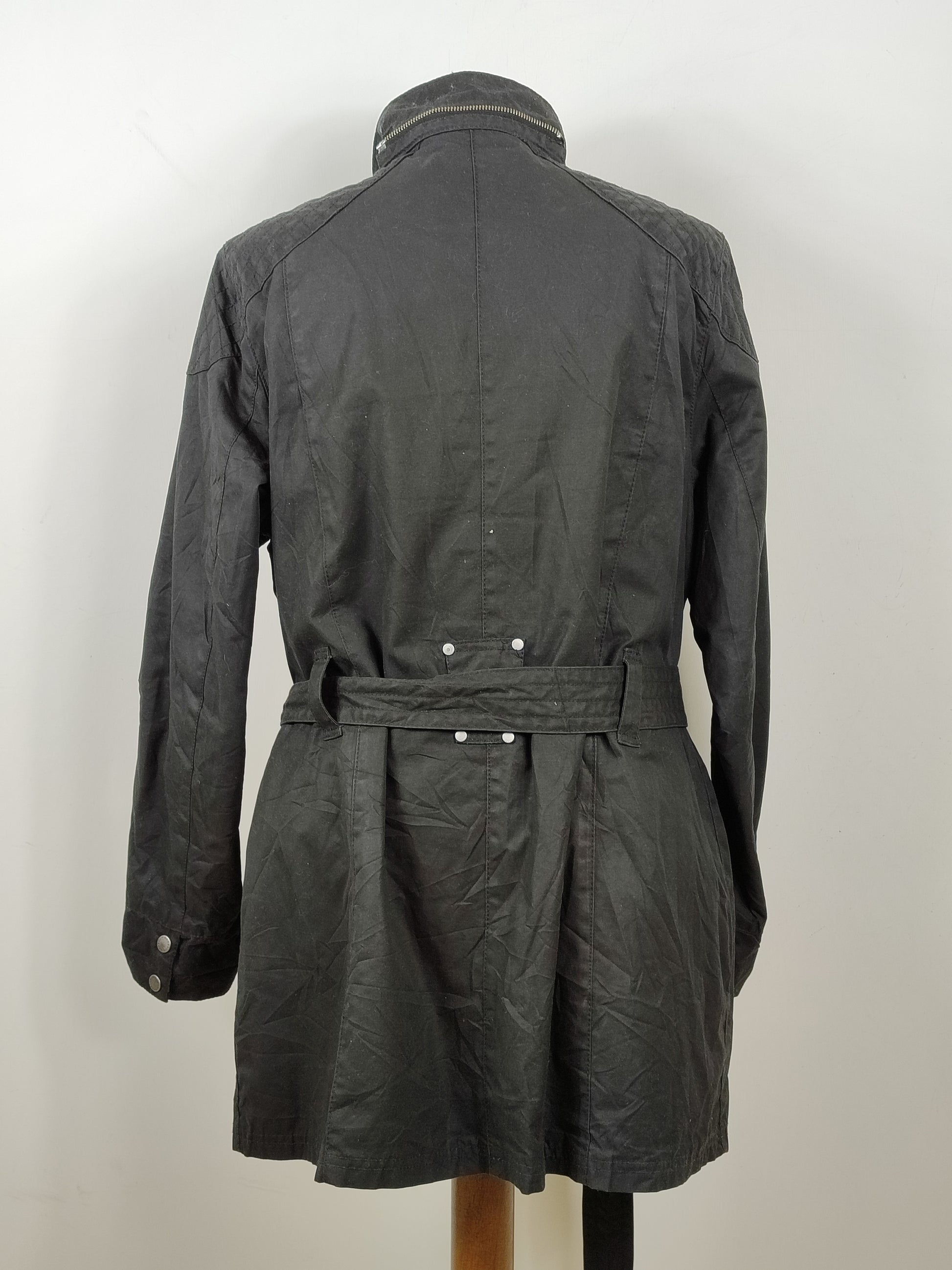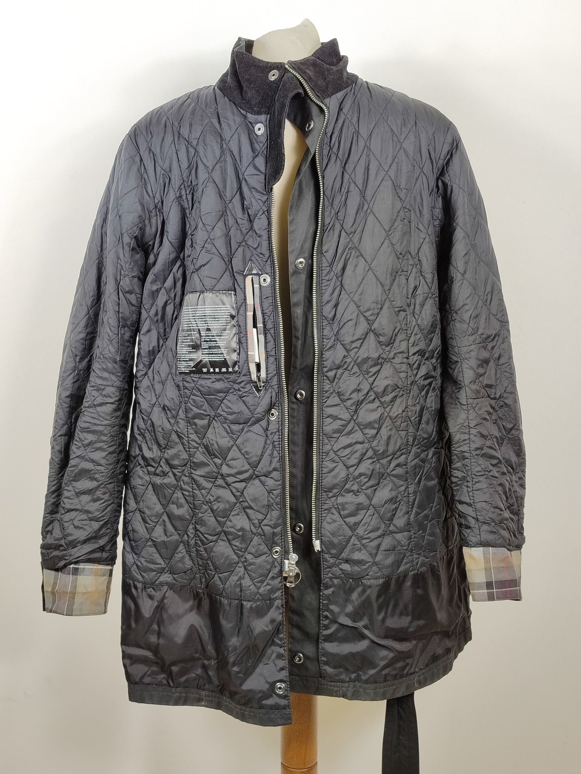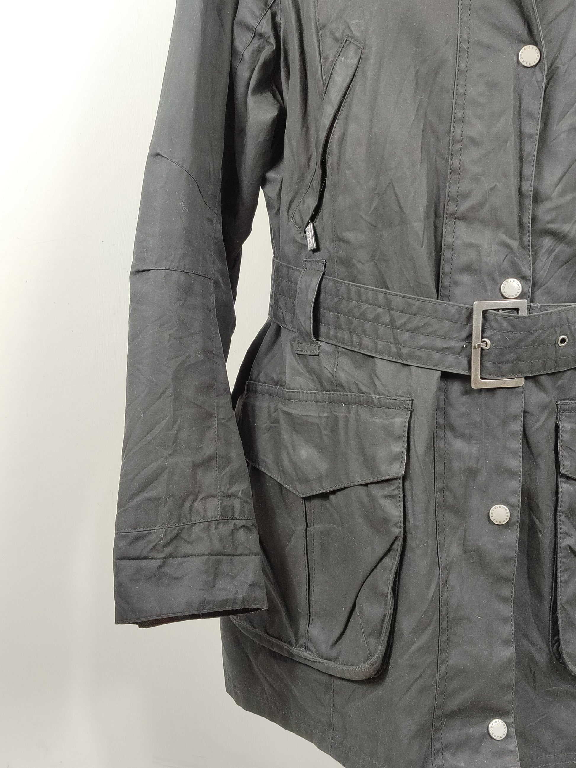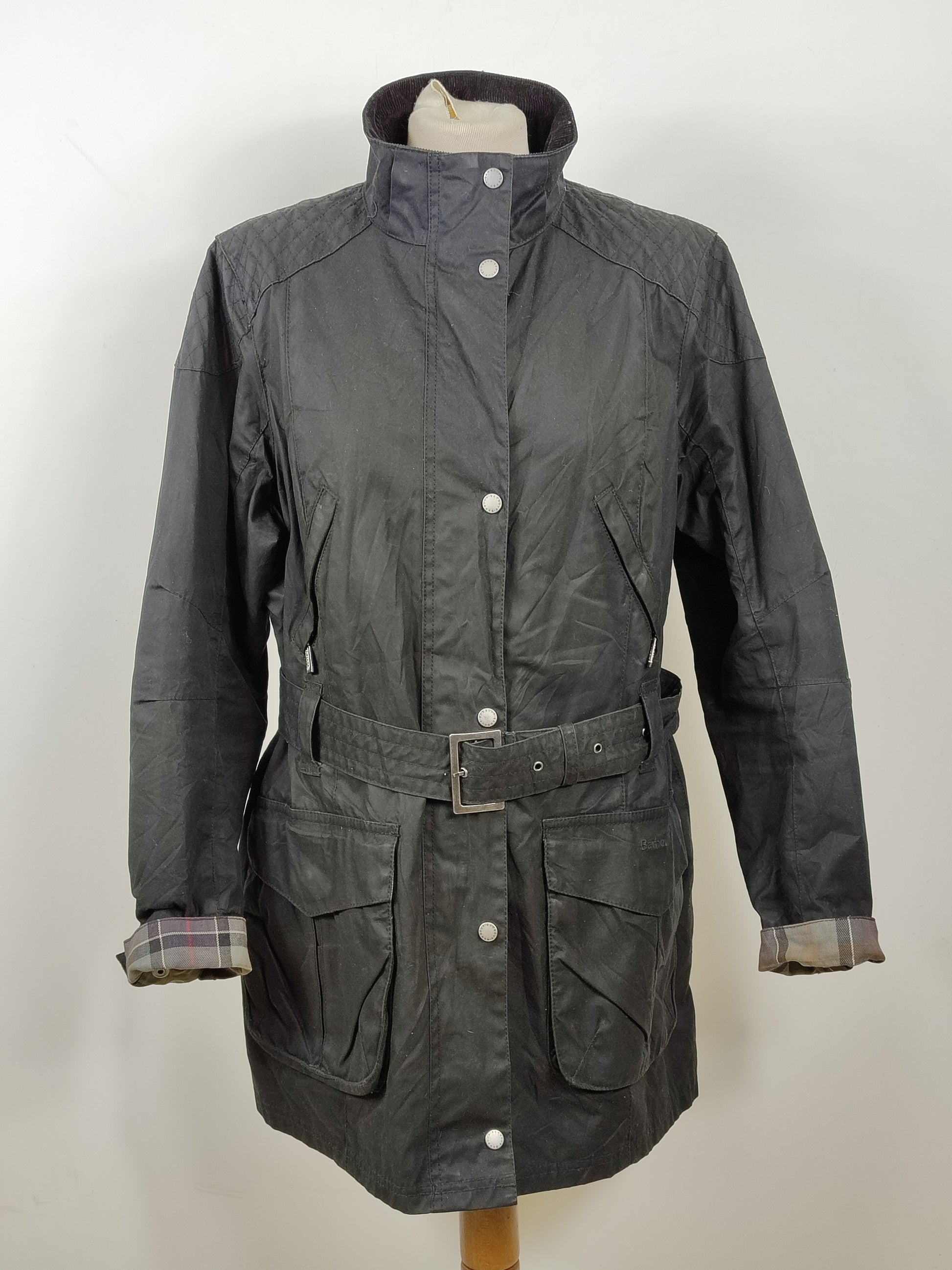 Giacca Barbour in cotone cerato di colore nero, trapuntata internamente come da foto. Completa di cintura