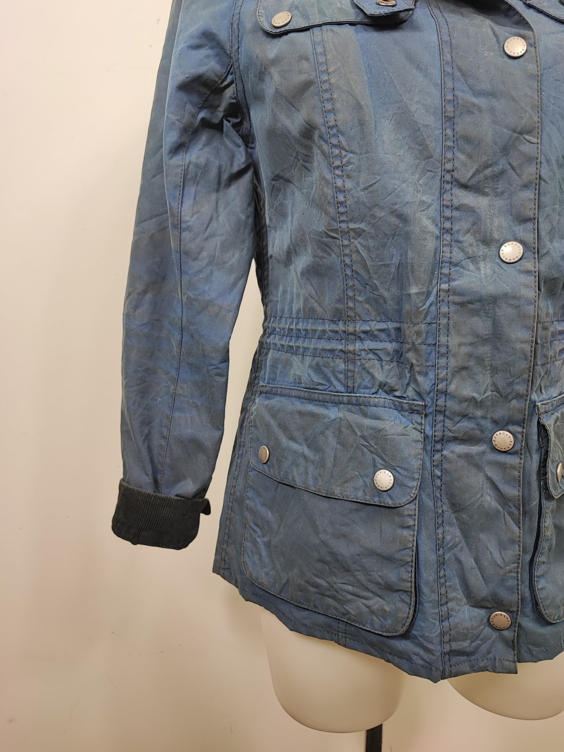 Giacca da donna vintage della linea Barbour International Modello Stockland di colore blu chiaro in cotone cerato taglia UK 10 corrisponde ad una 40 italiana circa ( LEGGERE MISURE QUI SOTTO).