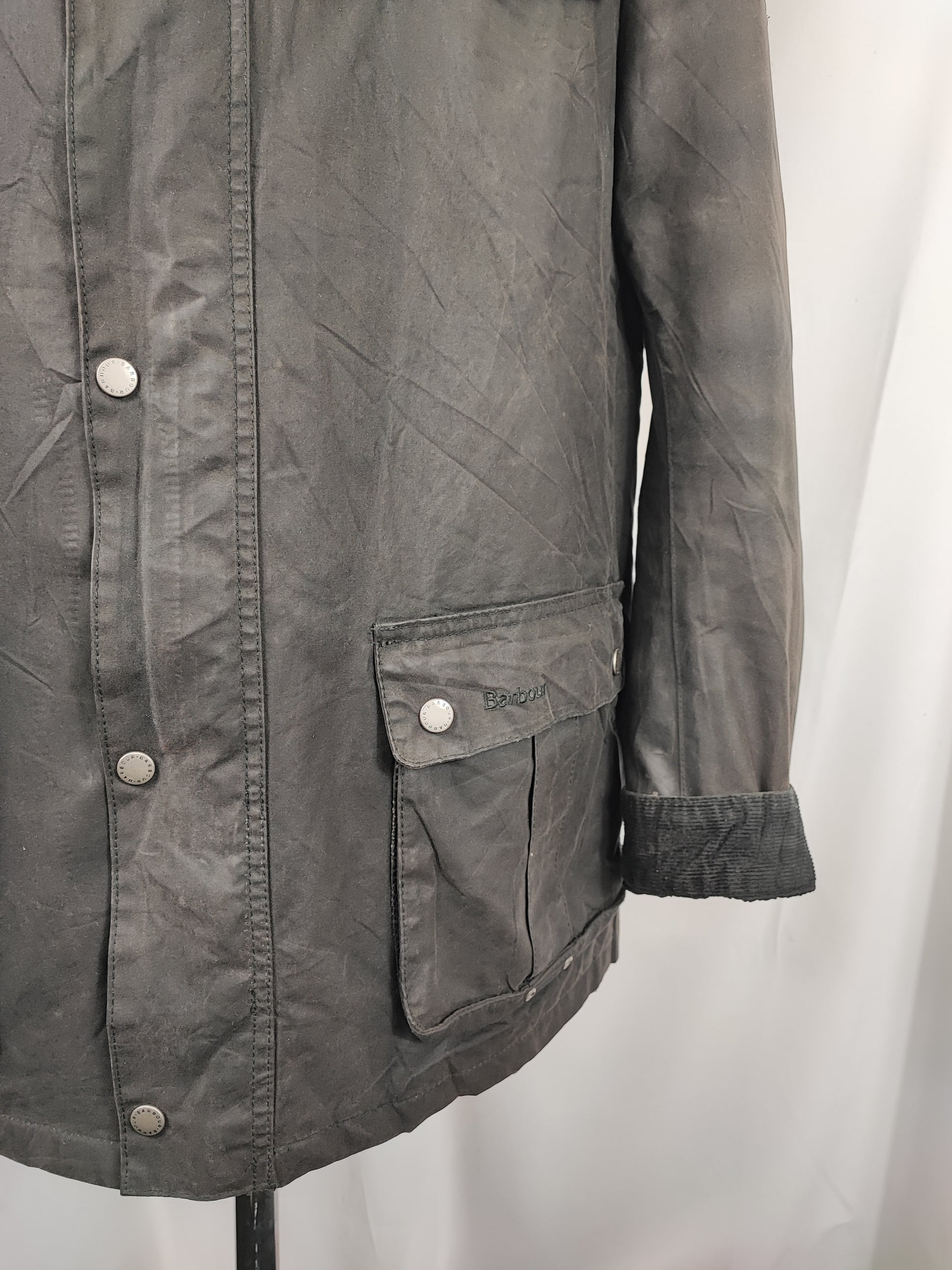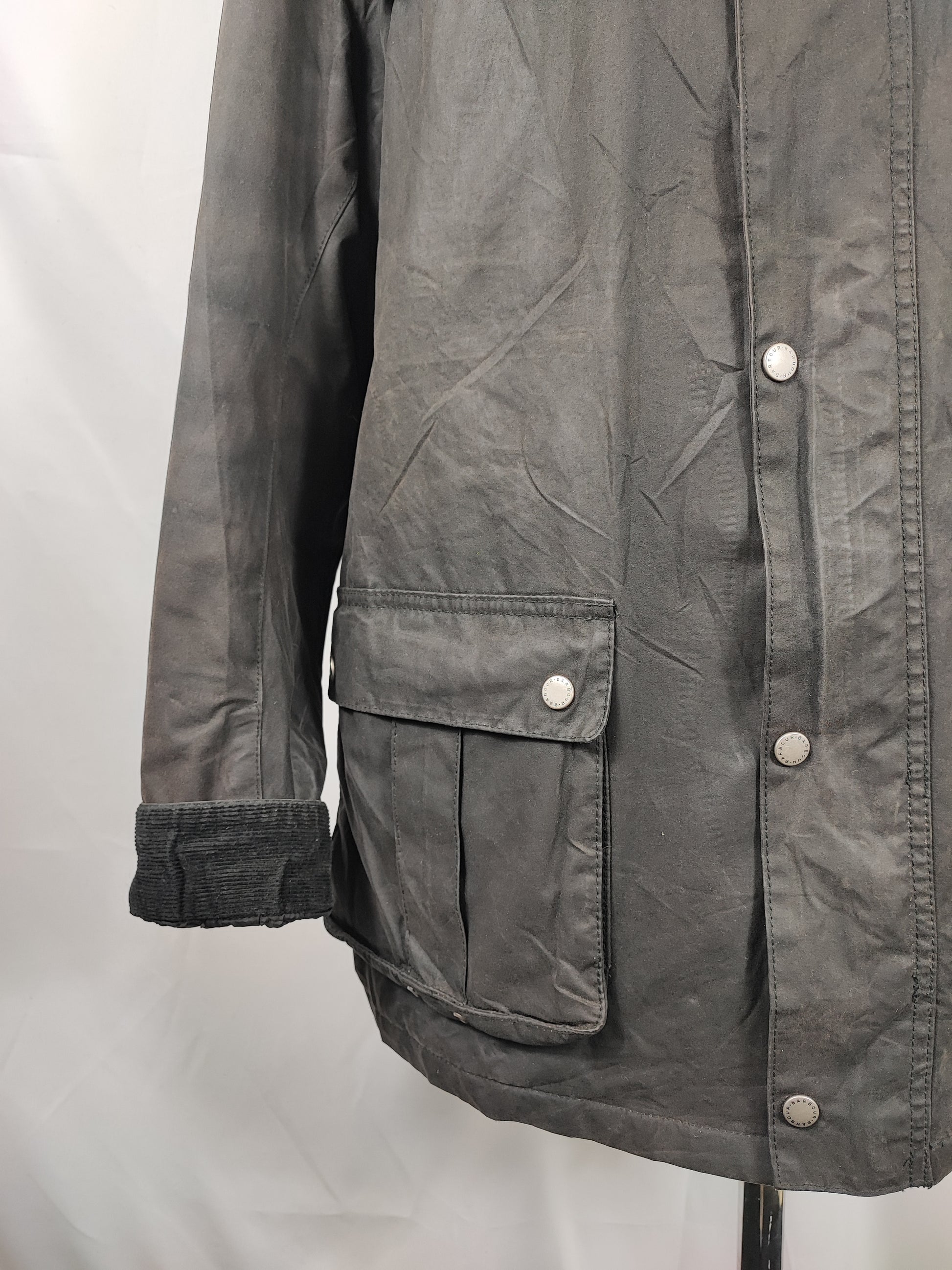 Fedele all'estetica da motociclista, presenta le quattro tasche esterne frontali , la chiusura centrale a doppio cursore , il colletto con chiusura a fibbia foderato in velluto a coste e il logo BARBOUR INTERNATIONAL sul braccio.