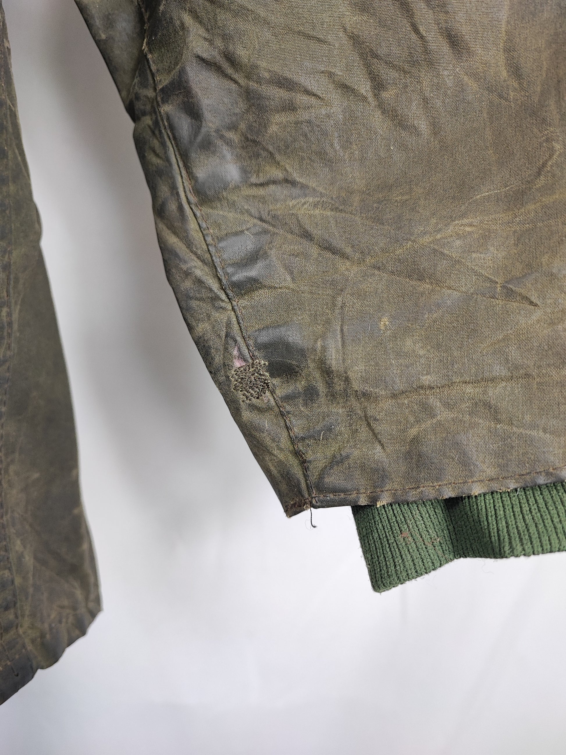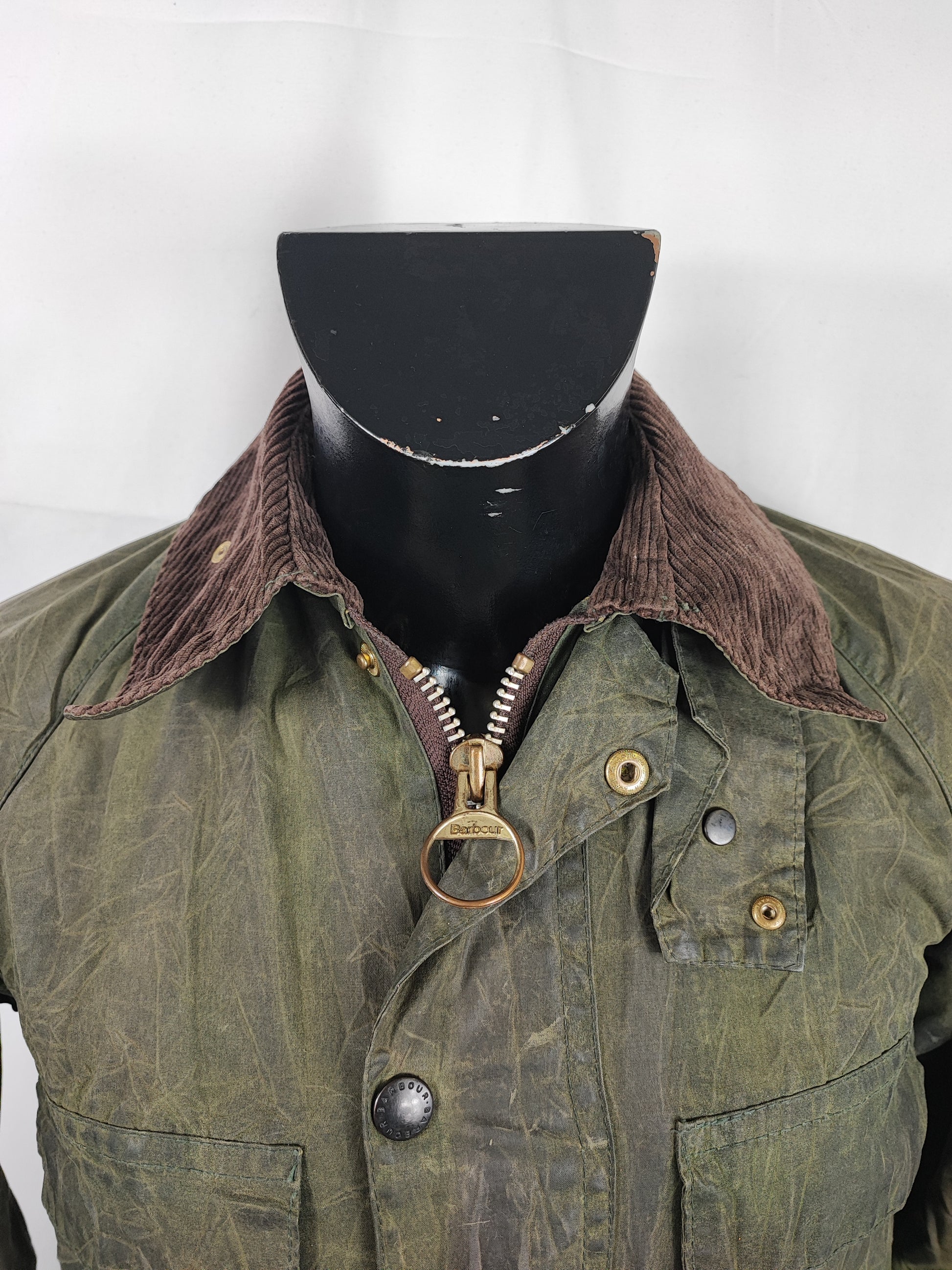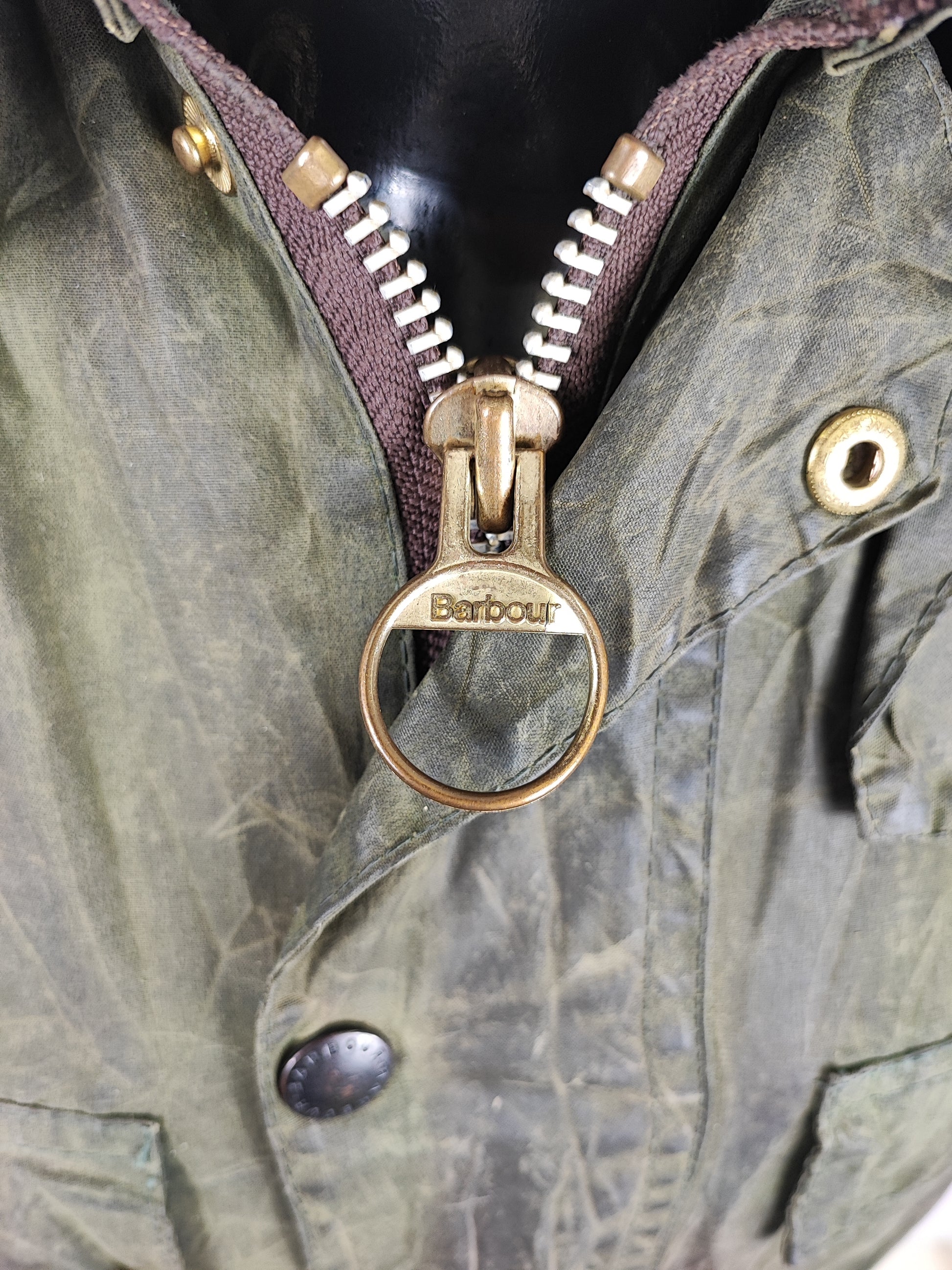 Buone condizioni generali . Zip funzionante, Logo Barbour della zip leggermente storto. Piccole riparazioni come da foto. Riparazione sulla schiena come da foto. Il capo è di SECONDA MANO.