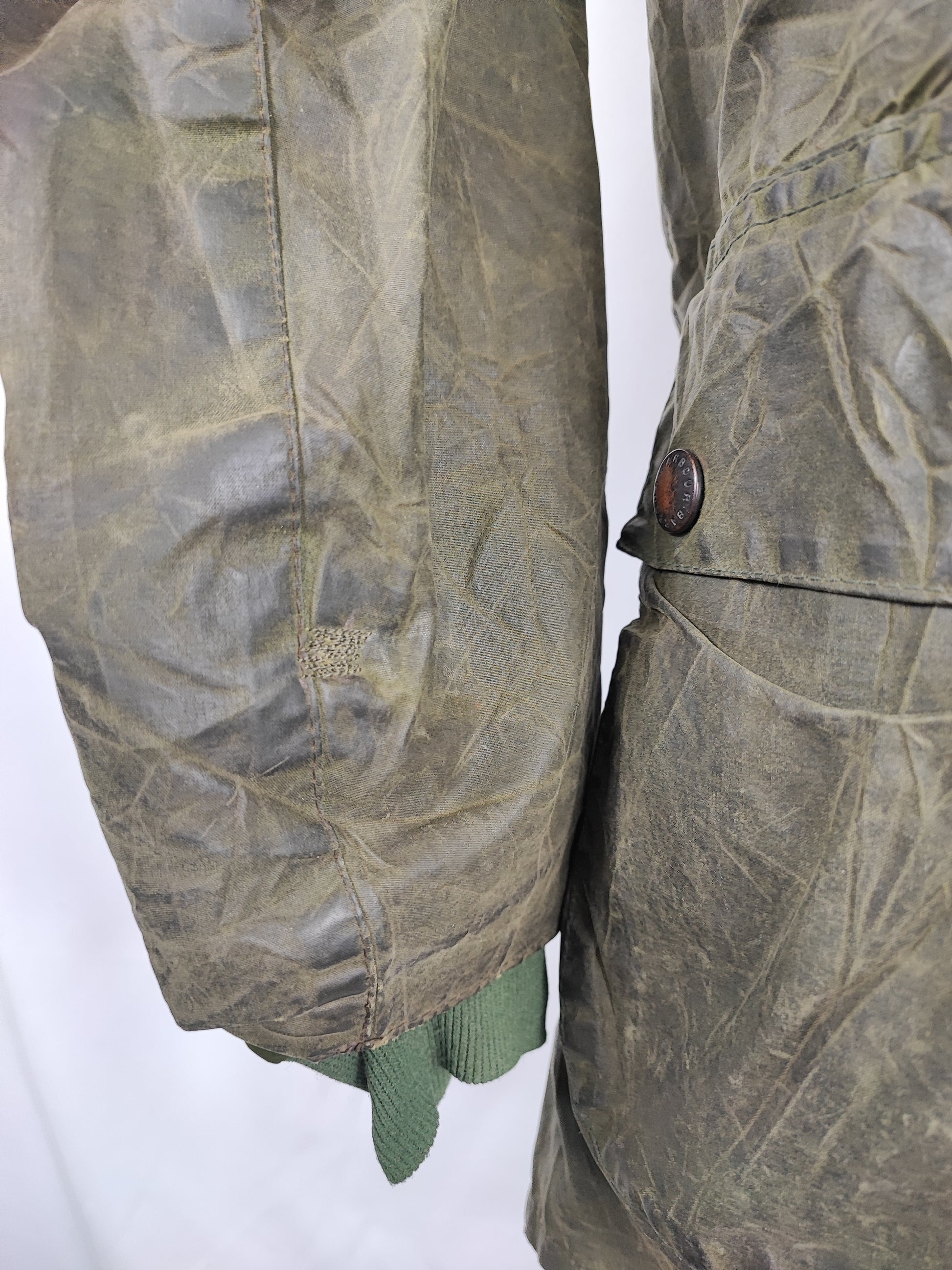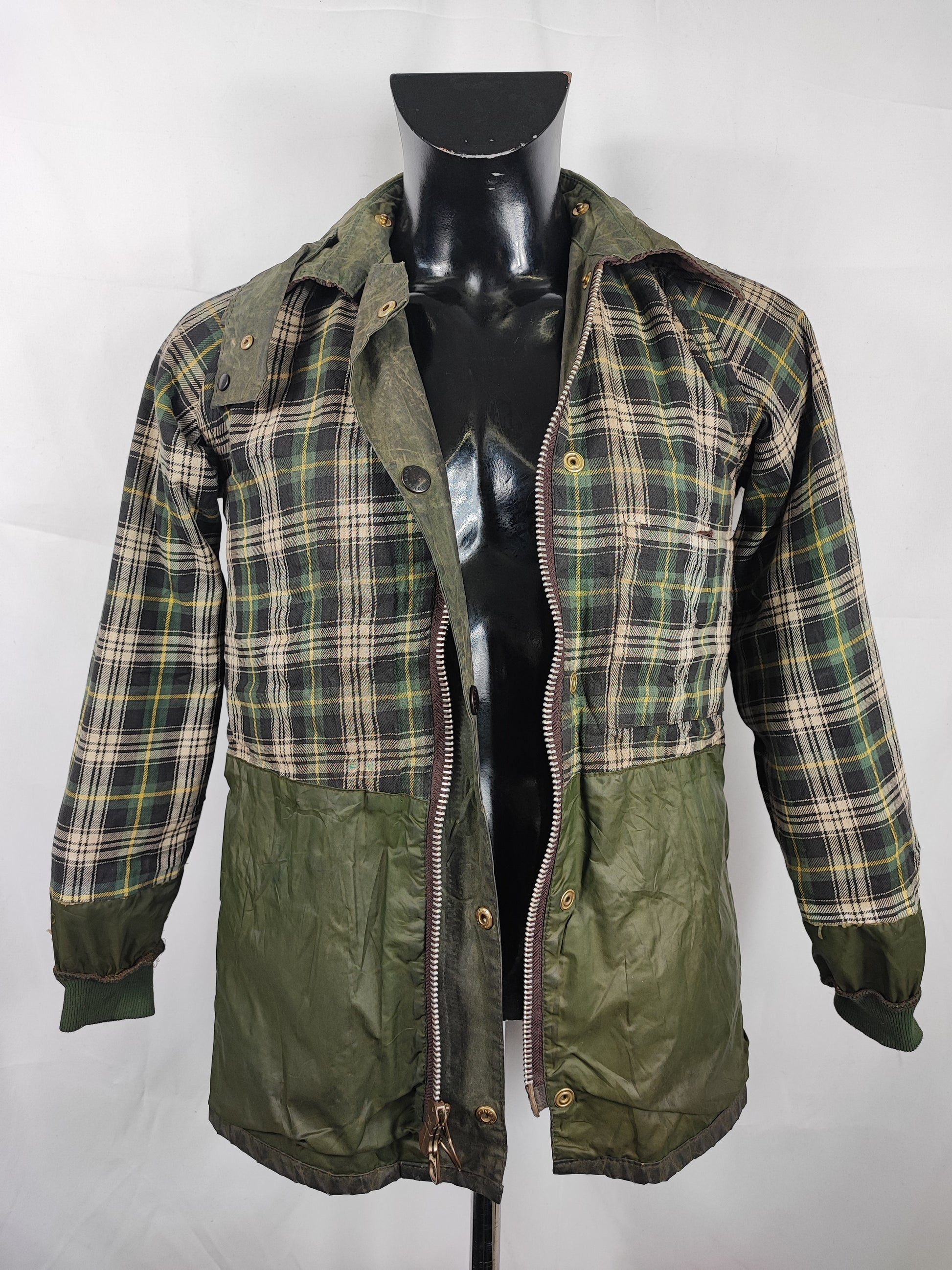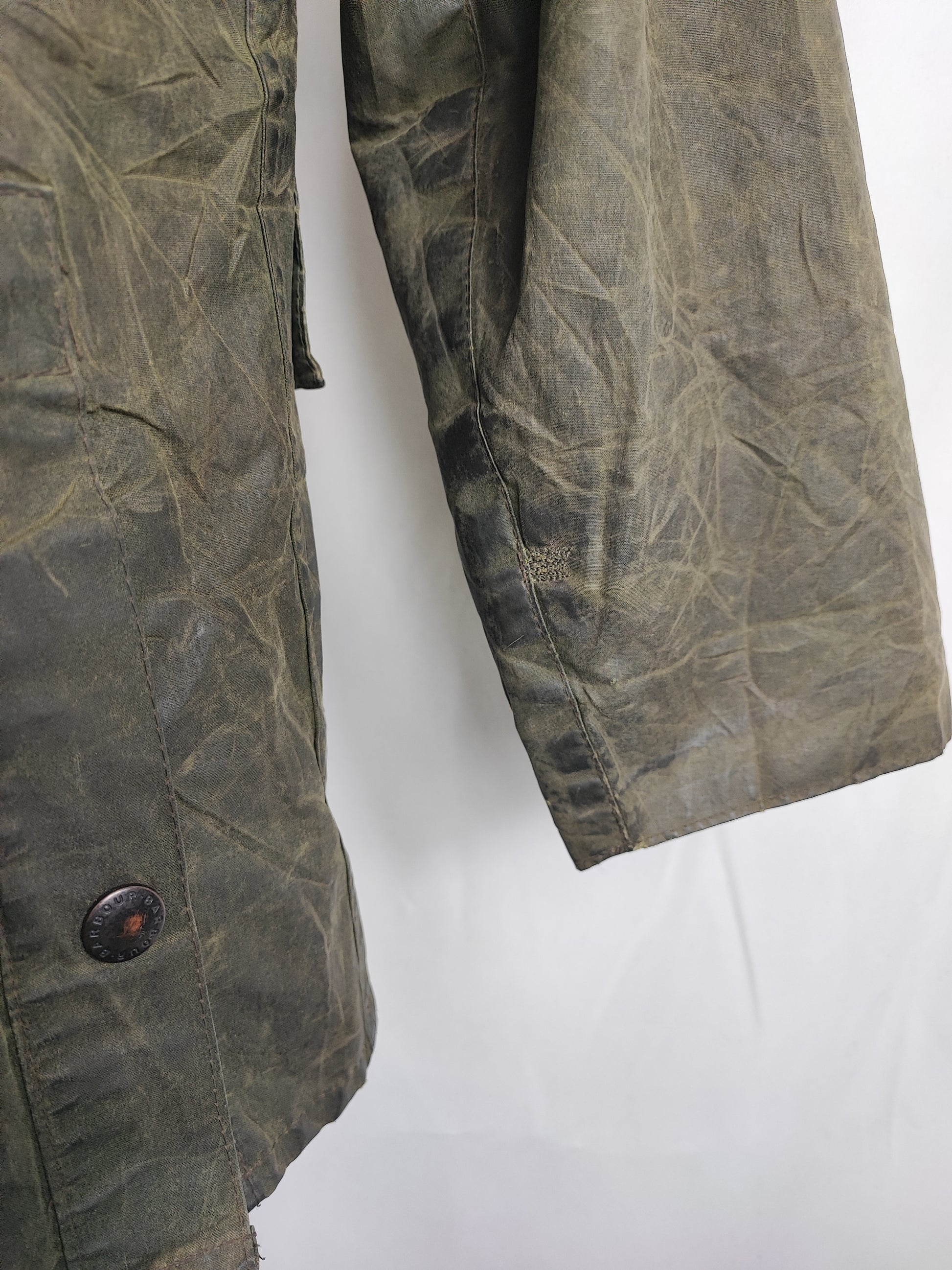 Buone condizioni generali . Zip funzionante, Logo Barbour della zip leggermente storto. Piccole riparazioni come da foto. Riparazione sulla schiena come da foto. Il capo è di SECONDA MANO.