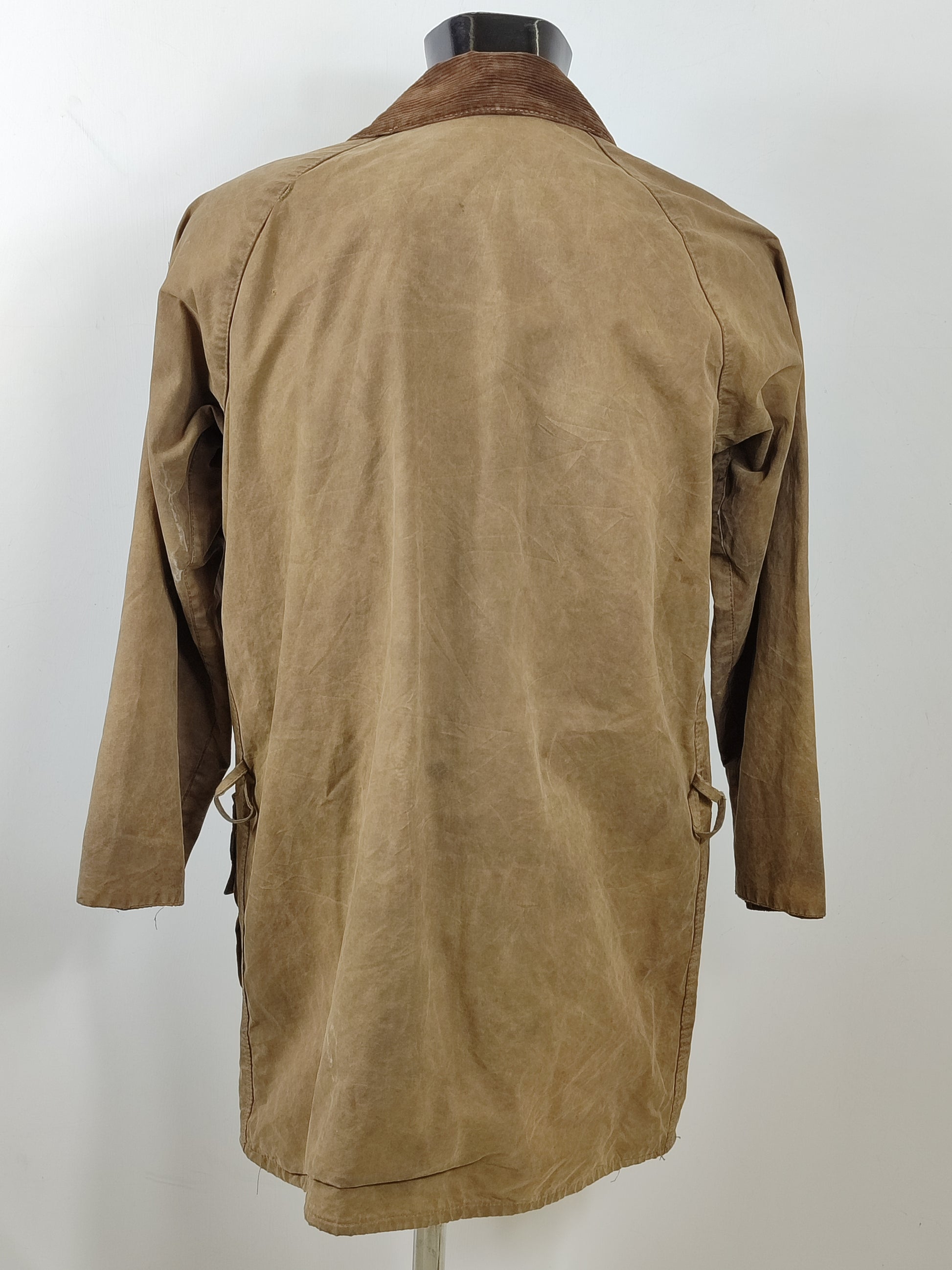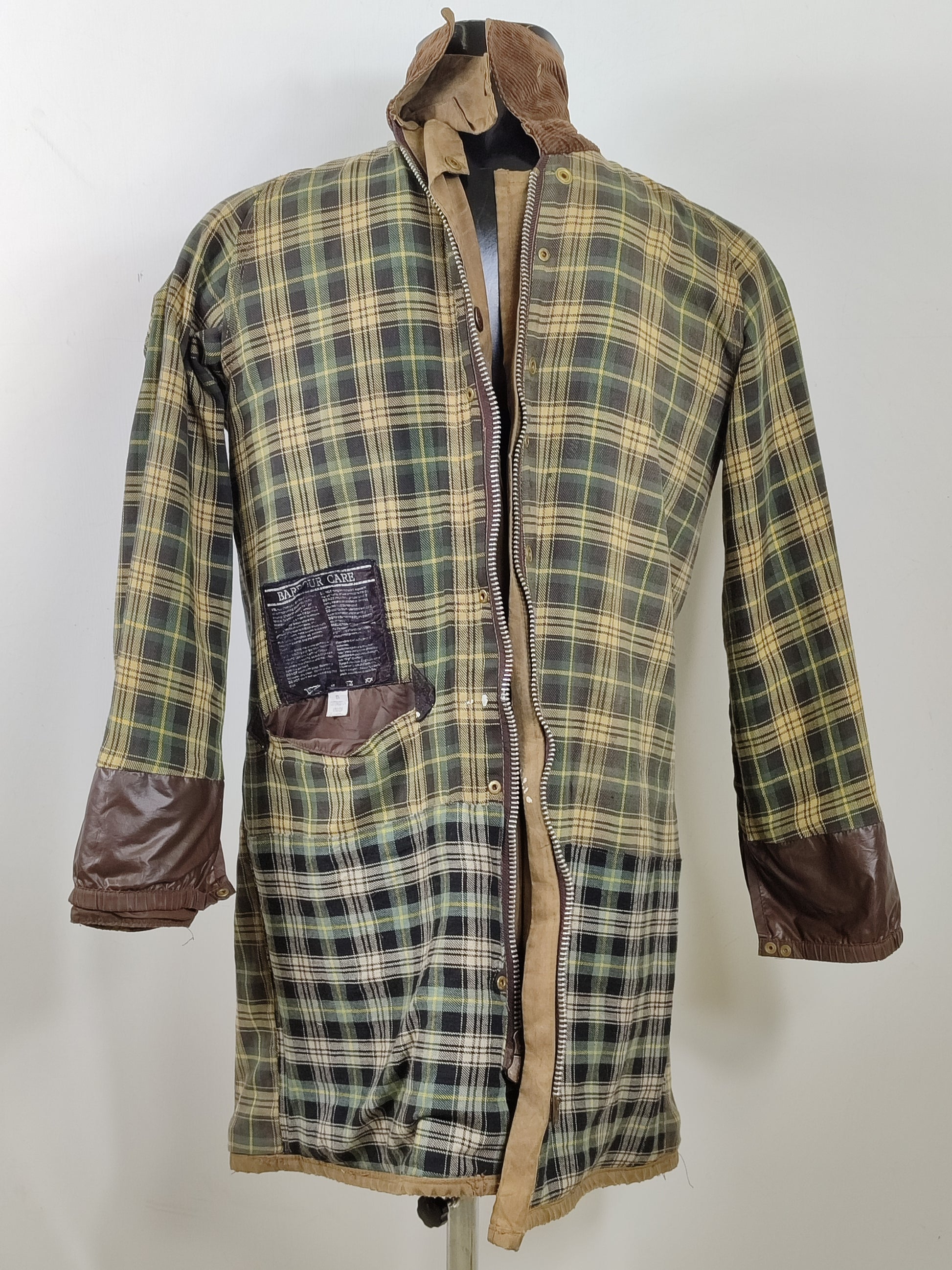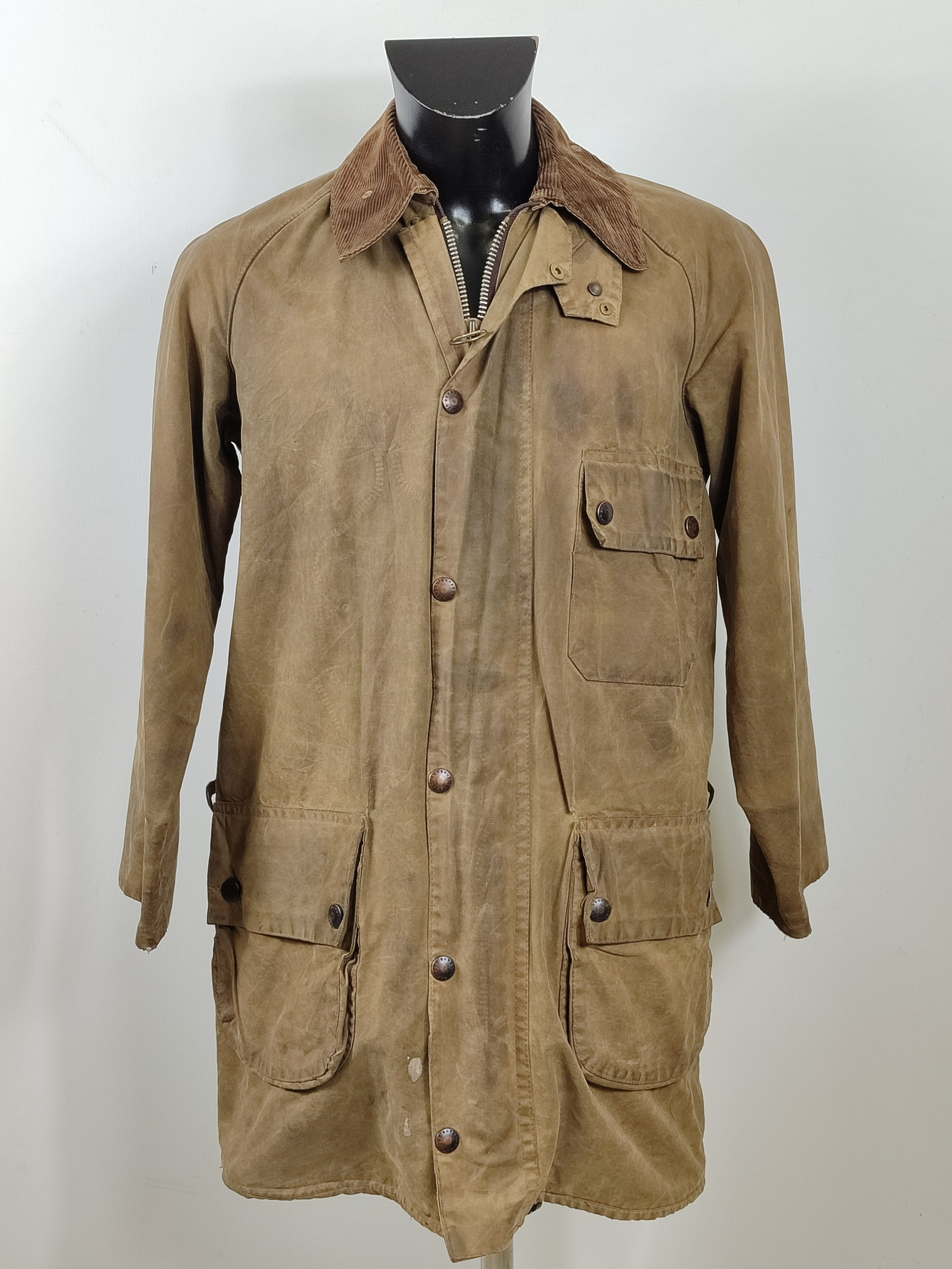 Giacca in cotone cerato con colletto in velluto a coste, maniche raglan , antivento interno regolabile Chiusura tramite cerniera a doppio cursore in metallo YKK . Predisposta per cintura . Due grandi tasche e una tasca sulla petto con chiusura tramite bottoni a pressione. Tasca interna impermeabile. Fodera in cotone in tipico Tartan Barbour. Colore verde A98.