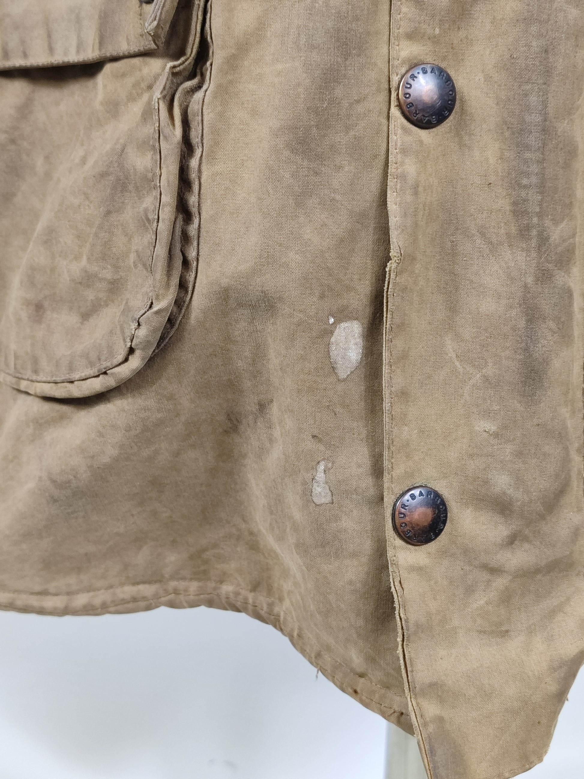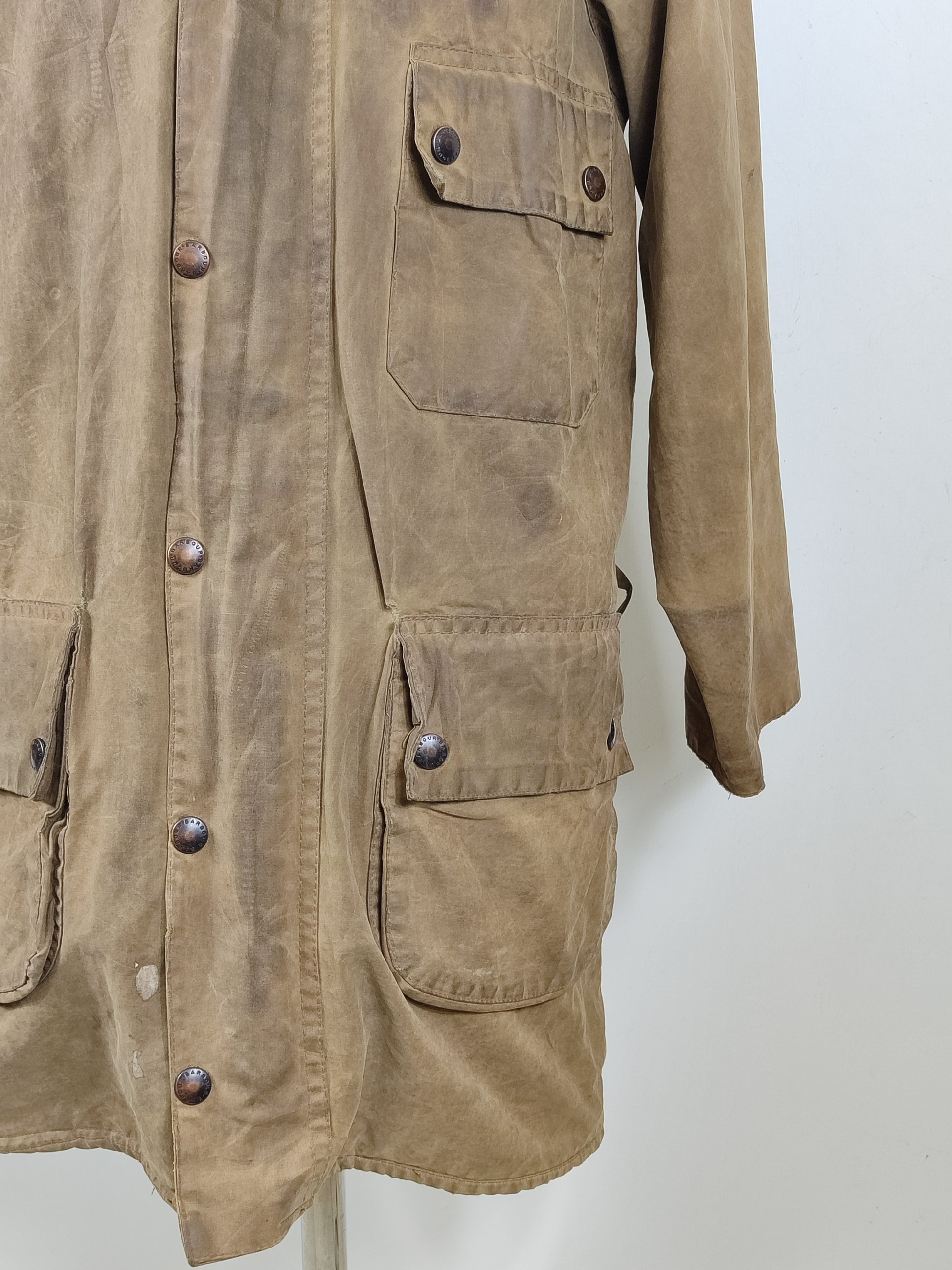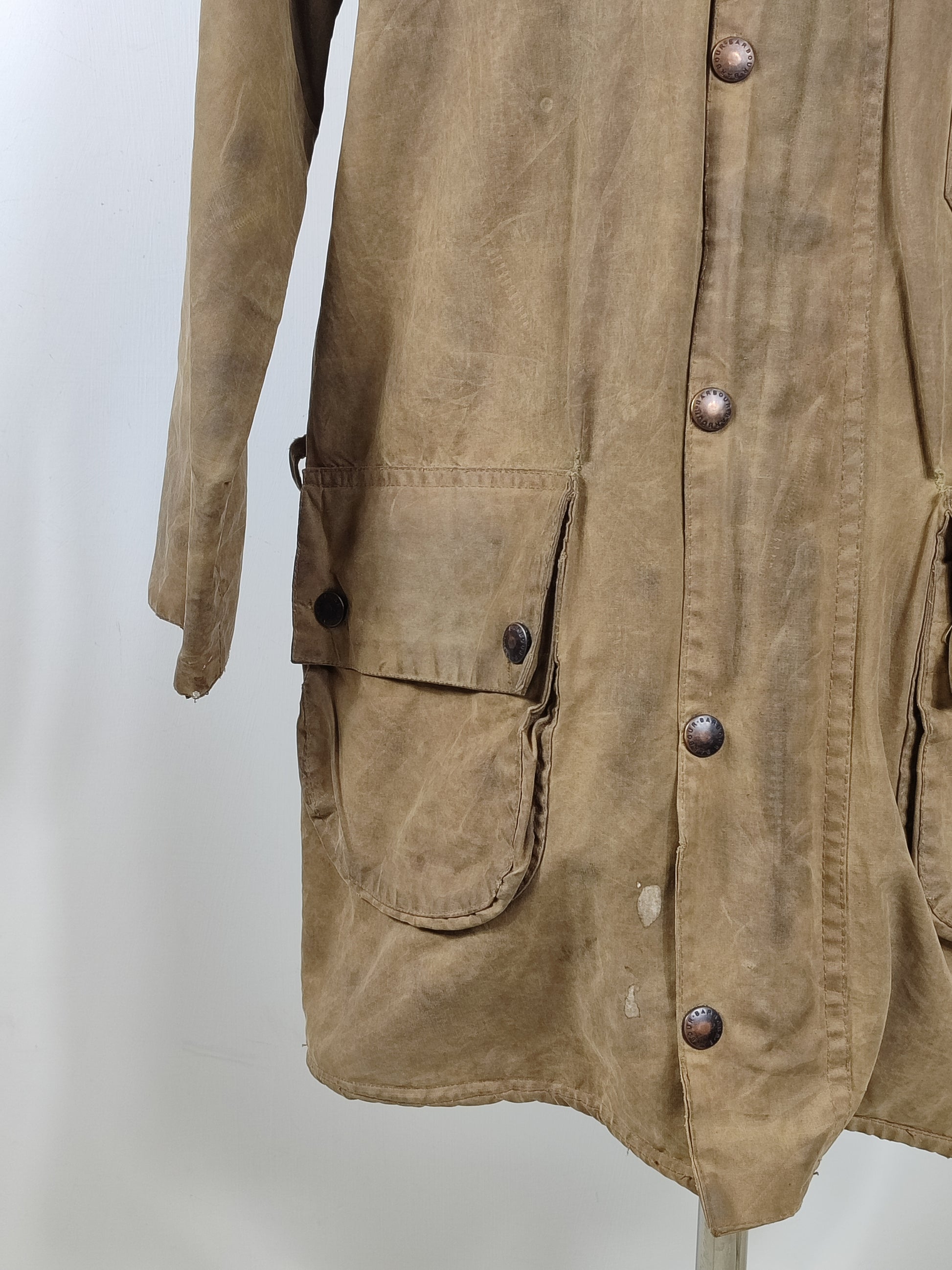 Buone condizioni generali. Si consiglia di ricerare la giacca per ravvivare il colore . Presenta delle macchie di vernice bianca . Manca la cintura. Il capo è di SECONDA MANO.