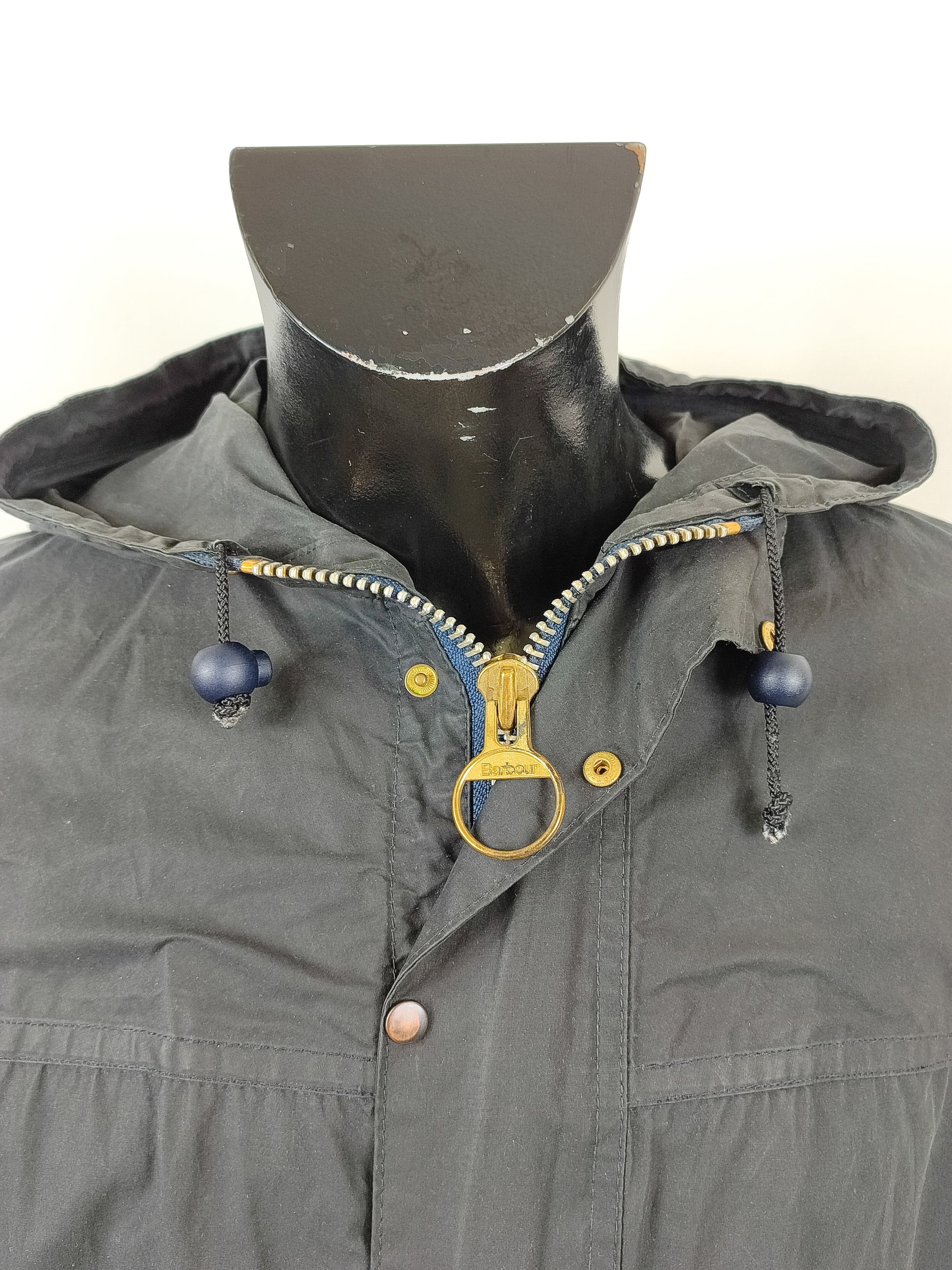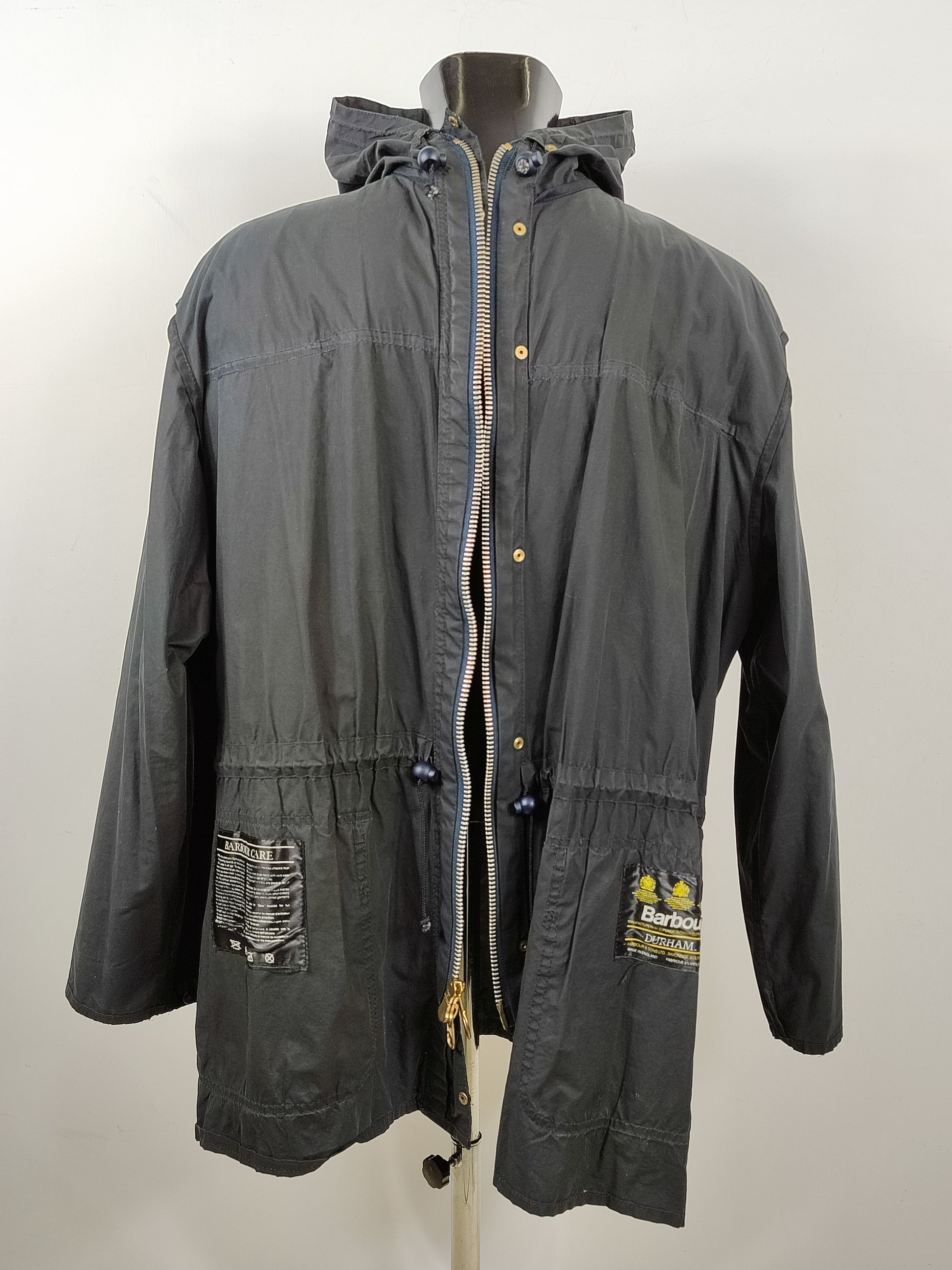 RARO Barbour vintage Durham blu con cappuccio C44/112 cm Navy Unlined Hooded waxed Durham Size L