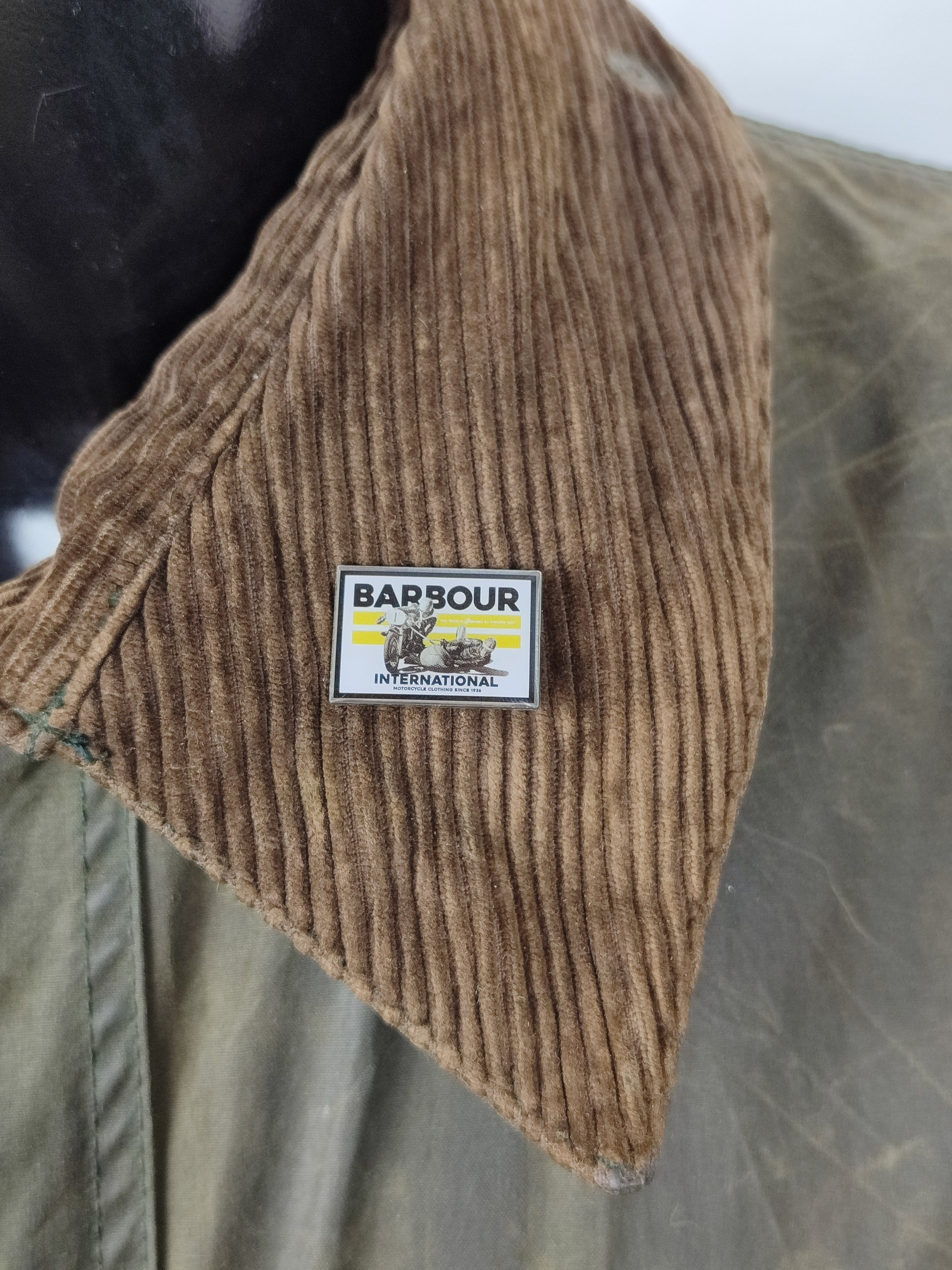 Spilla Barbour International raffigurante due uomini che stanno gareggiando in moto